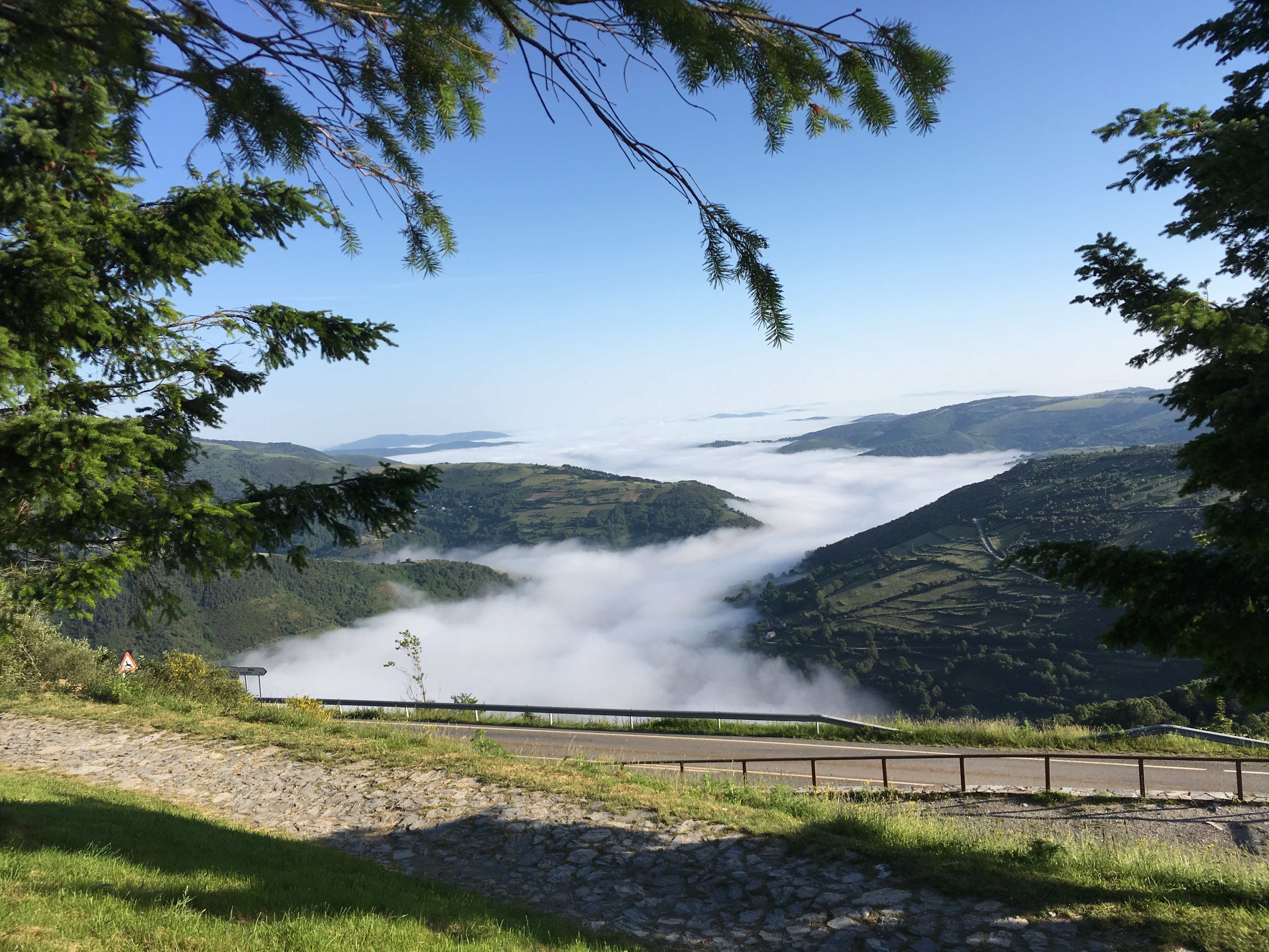 Der Ausblick hinter O Cebreiro ist atemberaubend, der Sonne so nahe und weit über den Wolken, die tief in den Tälern hängen und von hier oben wirken wie Seen.