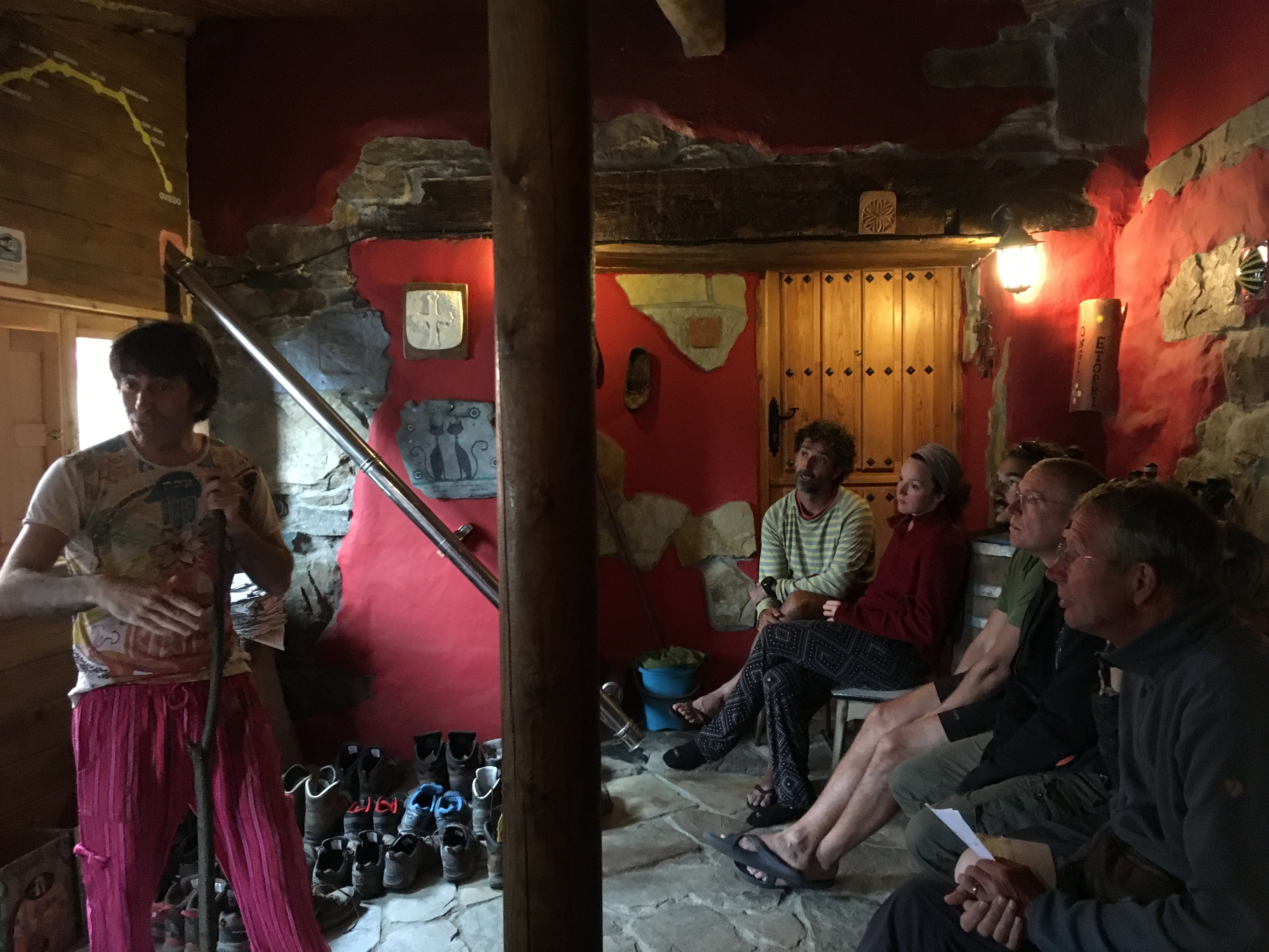Vor dem Abendessen gibt uns David noch einen Überblick über die Geschichte und die Beschaffenheit der nächsten Etappen auf dem Primitivo. Sehr unterhaltsam, höchst interessant und äußerst witzig.
