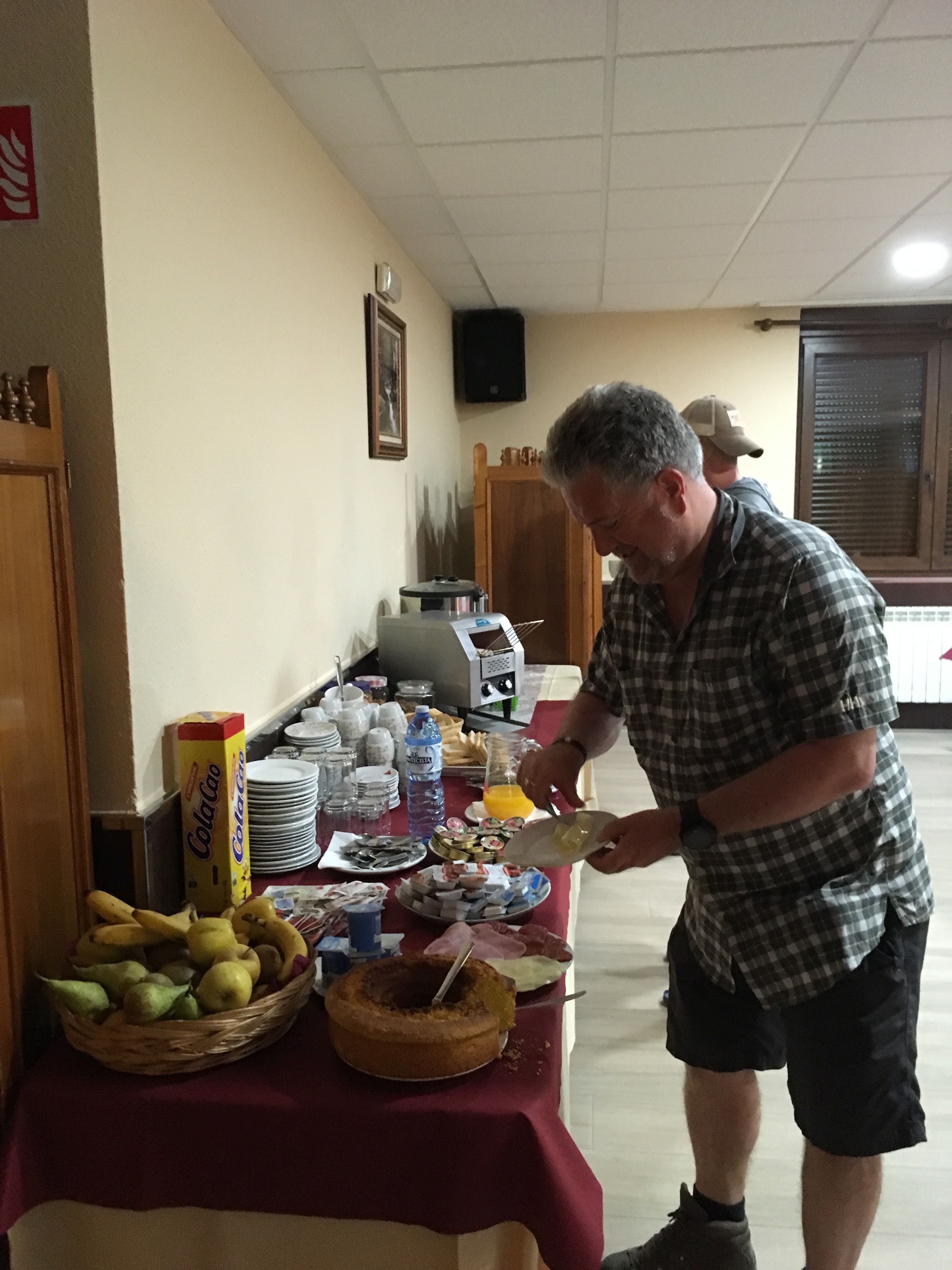Heute früh, zum Beispiel, waren Andrew aus Schottland und ich eine Weile gemeinsam unterwegs. Beide hatten wir nicht gefrühstückt und gehofft, unterwegs eine Bar zu finden. Nur wer eine Zeitlang abgepackte Kekse zum Frühstück bekommen hat – oder wahlweise eben nichts – kann unsere Freude angesichts eines kompletten Frühstückbuffets nachempfinden.