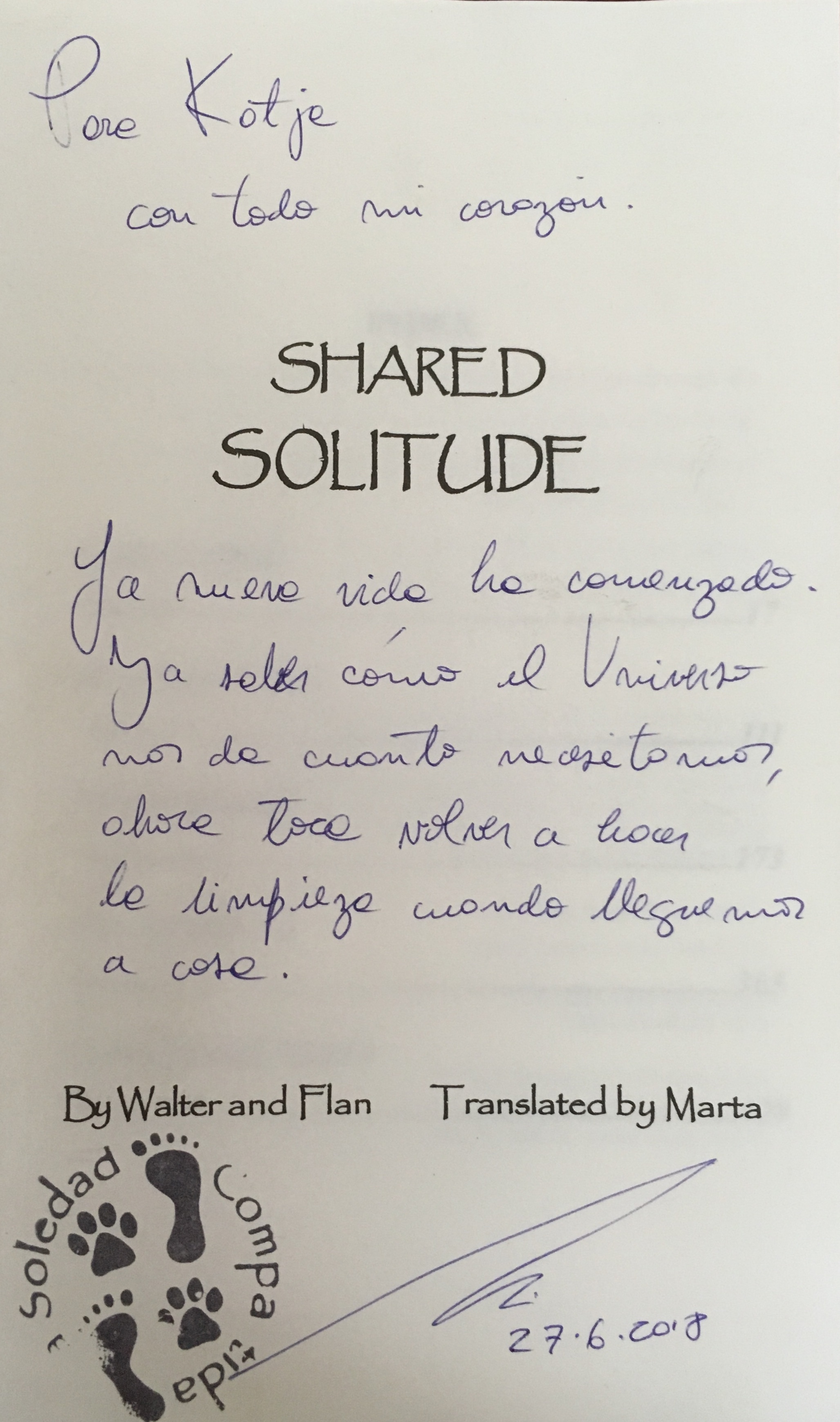 Dort habe ich im vergangenen Jahr eine sehr schöne egegnung mit Walter und seinem Hund Flan gehabt. Walter hat über seine Erkenntnisse vom Weg ein Buch geschrieben: La Soledad Compartida – Die geteilte Einsamkeit. Damals hat er mir versprochen, dass es in diesem Jahr eine englische Übersetzung gibt.