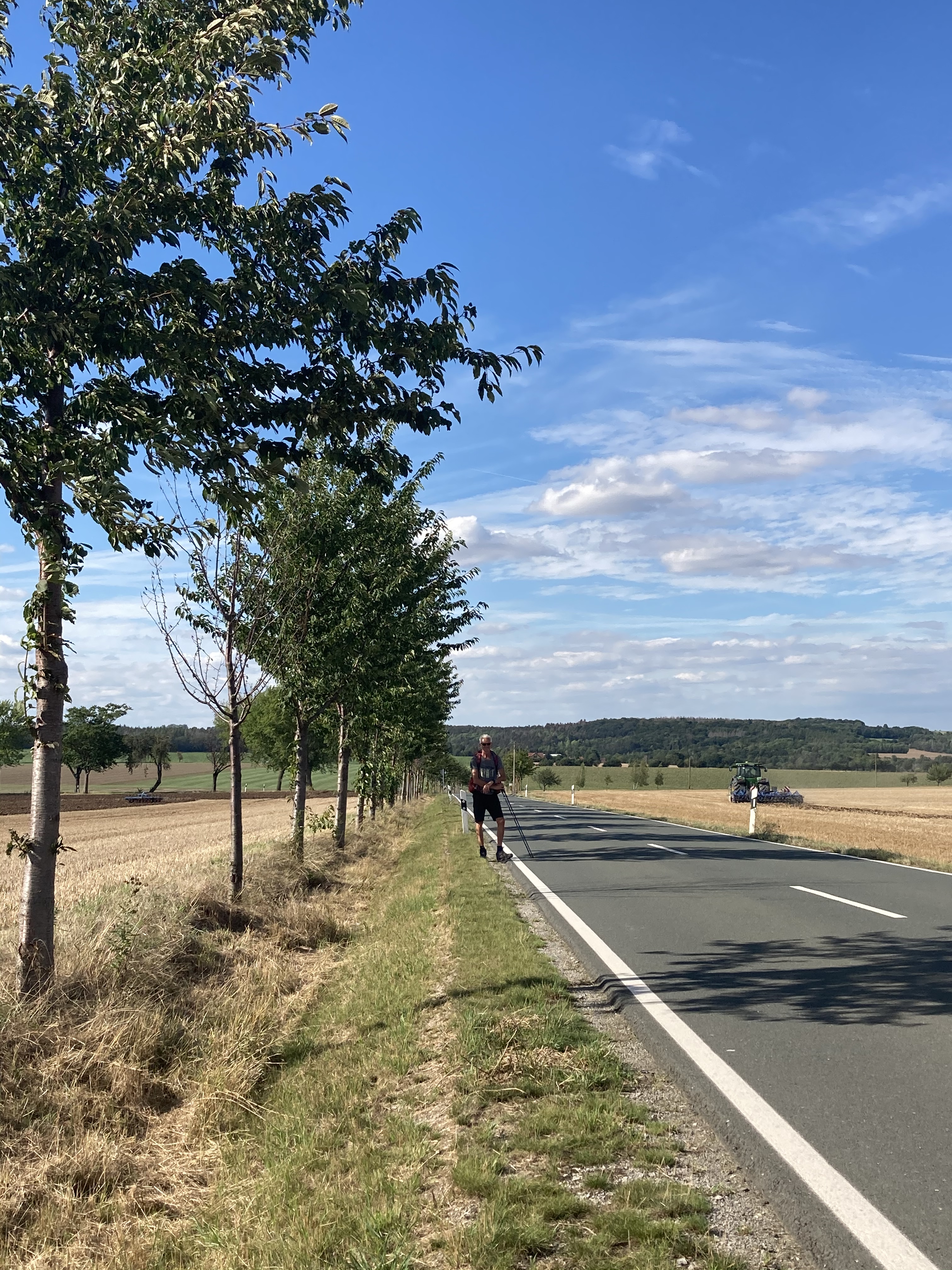 Hinter Bad Kösel geht es zwei Kilometer steil bergauf nach Fränkenau, dann ab Punschrau gibt es nur noch Asphalt, Hitze und kaum Schatten. Die Landschaft ist weit, ein wenig hügelig, abgeerntete Felder weit und breit. Meseta-Style. Wir bekommen in Punschrau eine letzte Chance auf ein Bett von einem netten Mann im LKW. „Ihr verpasst was“, meint er, als wir ablehnen.