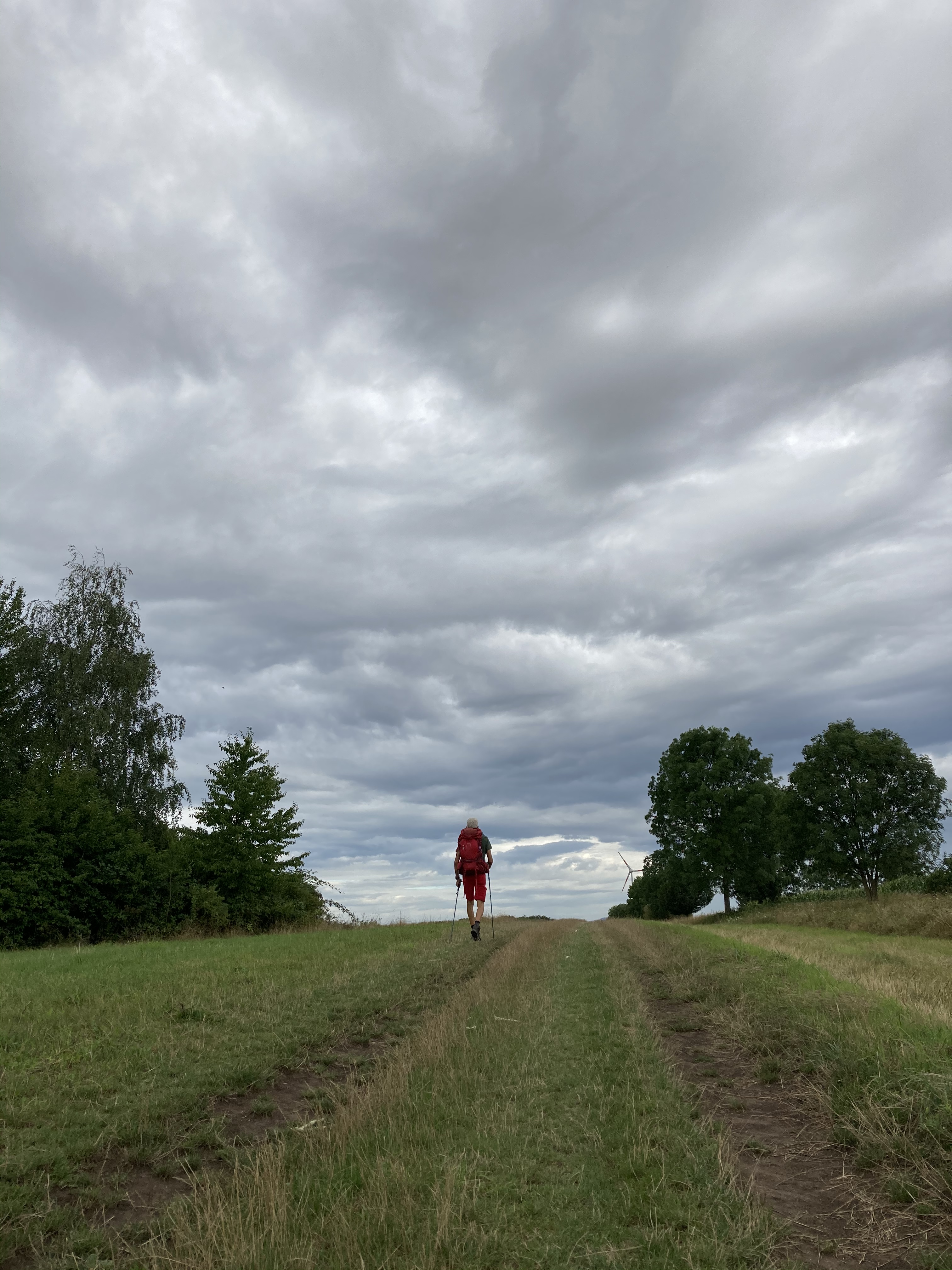 Der Weg führt heute lange Zeit übers Feld, unter der A 71 hindurch. Asphalt wechselt sich mit Schotterpiste und zuweilen sehr angenehmen Wiesenwegen. Der Blick rundherum ist frei. Wir schauen weit ins Land auf die Drei Gleichen, die ich bisher nur von besagter Autobahn her kenne. Weit voraus gibt es eine hohe Kuppe, der Inselsberg. Das erfahren wir von einem der Radfahrer, die uns hier überholen und auch zuweilen gerne mal auf ein Schwätzchen anhalten. Unsere Rucksäcke machen neugierig. Hier in Thüringen ist auch wieder ein anderer Menschenschlag unterwegs. In Sachsen-Anhalt haben wir die Menschen gelinde gesagt zurückhaltend erlebt. Thüringen zeigt sich weit offener.