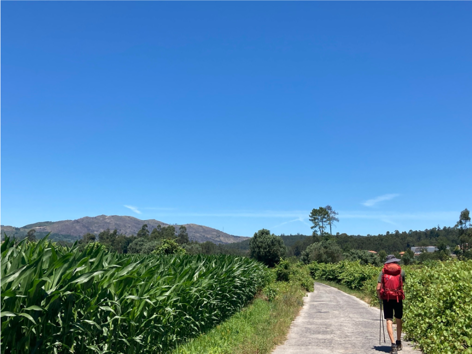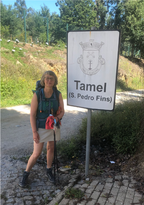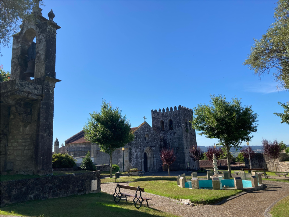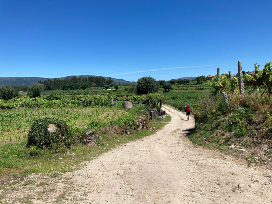 Die Sonne brennt heiß, und unter der Maske lässt es sich kaum aushalten. Ich muss mich heute also ganz schon durchbeißen. Bis hinauf zur Abade de Neiva geht es mal wieder über Kopfsteinpflaster über Dorfstraßen, die zum Glück mal nicht von rasenden Autos frequentiert sind. Etwa ab Tamel ist der Weg auf langen Strecken von Olivenbäumen und Weinreben gesäumt, es gibt wenig Schatten. Wir laufen durch Ebene und bieten der Sonne volle Angriffsfläche.