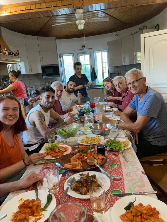 Wir sind heute eine internationale Gruppe und dürfen alle zusammen an der langen Tafel in ihrer Küche speisen Heute sind wir drei Deutsche, vier Italiener, zwei davon, wie sich später herausstellt, sind katholische Priester, eine Polin und zwei Tschechinnen.