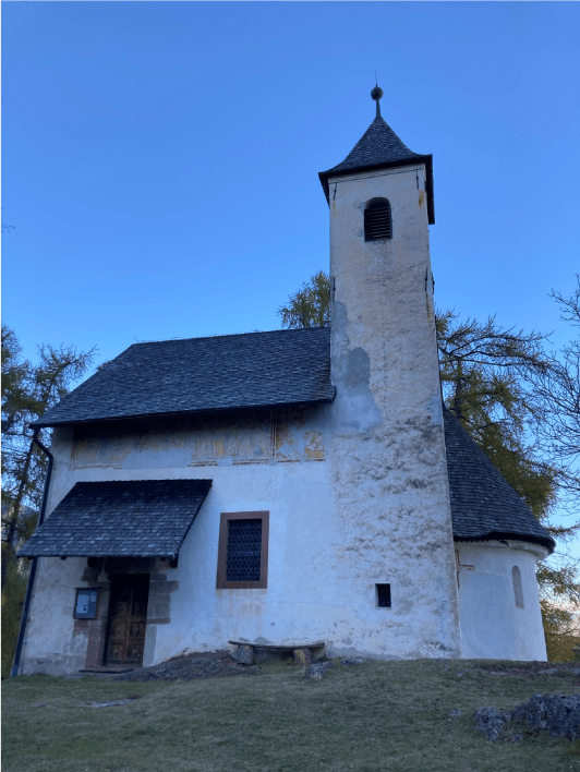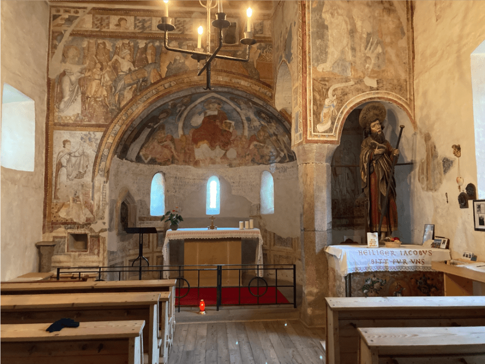 Zuvor mussten wir jedoch noch einmal steil den Berg hinauf mit atemberaubendem Blick auf die Sarntaler Alpen. Die Freude übers Obensein wurde schon recht schnell durch einen weiteren langsamen, aber stetigen Abstieg in den kalten und feuchten Wald hinunter getrübt. Nun ja, so ist es eben in den Bergen. Wenn Du denkst, Du bist oben und es kann jetzt eigentlich nicht mehr viel Steigung kommen, sorgt der Weg schon dafür, dass Du erst ab- und dann wieder aufsteigen musst. So ging es uns auch. Doch unsere Mühe wurde belohnt durch das wunderschön auf einem Hügel gelegene Jakobus-Kirchlein von Grissian mit seinen mittelalterlichen Fresken. Einen Stempel und ein Buch mit Bitten an St. Jakob gab es hier auch. Wir hielten uns eine ganze Zeitlang an diesem wirklich besonderen Ort auf, bevor wir über den Besinungsweg zum Ort hinunter gingen. Der Besinnungsweg thematisiert die sieben Sakramente und wurde von einem Tersianer Glaskünstler gestaltet. Ich hätte dem Weg sicher mehr Aufmerksamkeit geschenkt, wenn es nicht allmählich Zeit geworden wäre für den Abstieg. Die Dunkelheit drohte uns mal wieder einzuholen.