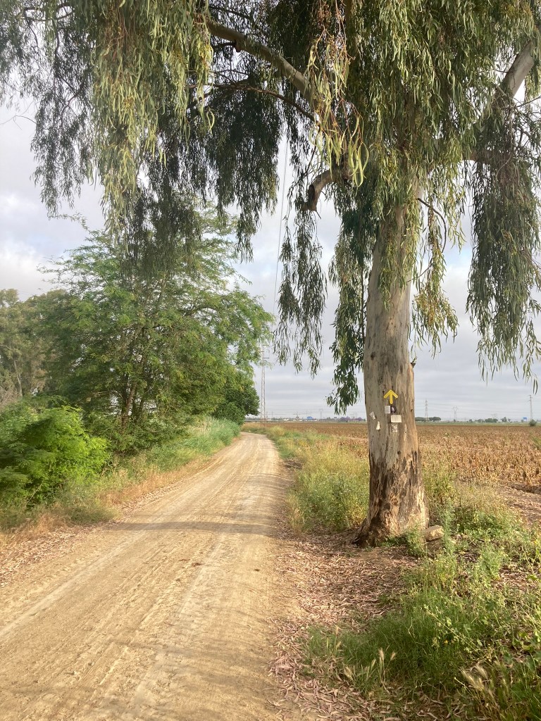Auf der einsamen Strecke vor und hinter Santiponce kommt mir der Gedanke, dass ich diesen Camino der Dankbarkeit und Demut widmen möchte. Und demütig werde ich wohl, denn ich bin wegen der Bänderdehnung schon mit einer Sehnenreizung angereist und heute meldet sich meine Achillessehne. Schlagartig bin ich beunruhigt und versuche, möglichst kleine Schritte zu machen. Hoffentlich hält mein linker Fuß. Ohnehin ist mir seit langem bewusst, dass dieser Weg mit den langen und einsamen Etappen ohne Schatten für mich zum allerersten Mal wohl auch eine physische Herausforderung wird.