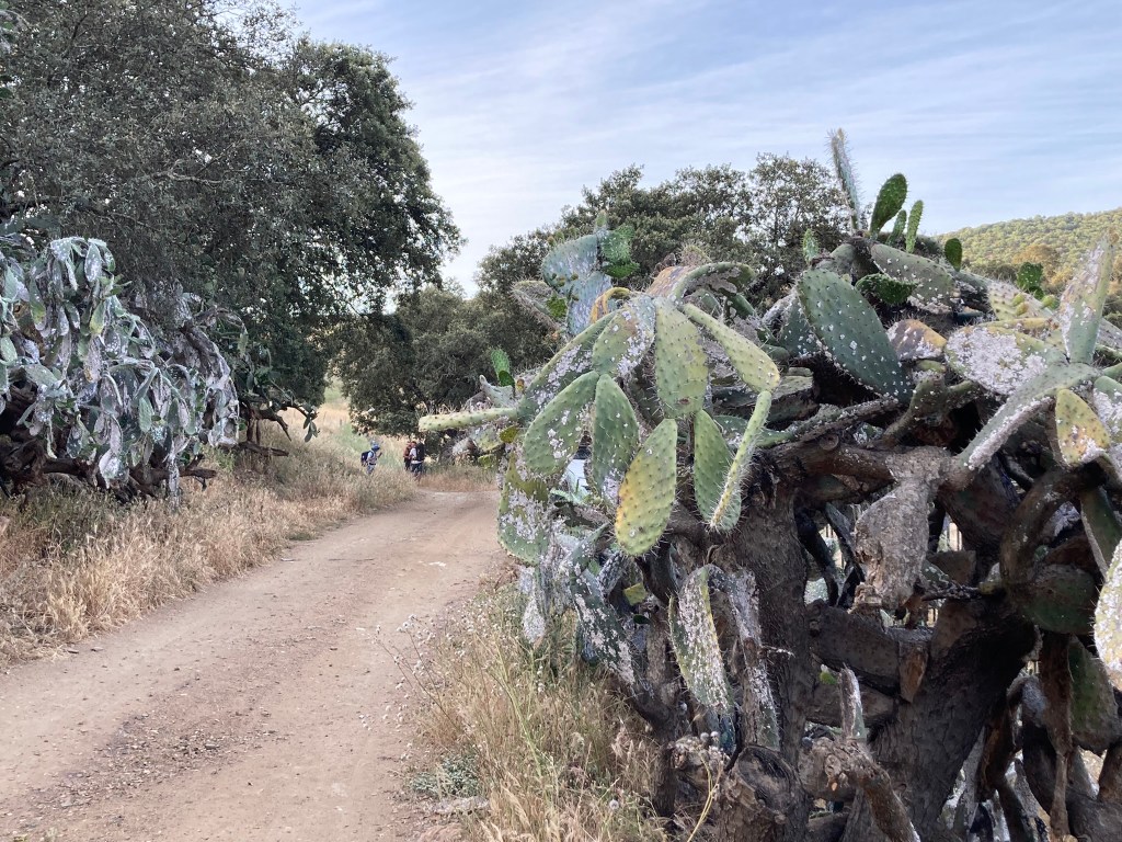 Der Weg aus dem Ort hinaus führt, wie so häufig auf der Via de la Plata, an der Stierkampfarena vorbei. Es ist beinahe frisch an diesem Morgen, doch die Sonne ist auch noch nicht ganz aufgegangen. Ich genieße die Morgenkühle auf dem kakteengesäumten Weg. Heute ist hier allerhand los. Hundert Meter vor mir habe ich den Kalifornier John um die Ecke biegen sehen, nach wenigen Minuten holt mich der Slowene Gorazd ein und berichtet mir freudestrahlend, dass der Spanier gestern Abend sein Handy wieder in Gang gebracht hat. Jetzt kann er endlich wieder Fotos schießen. Und wenig später kommen zwei Schweizer von hinten herangestürmt. Einer der beiden grüßt freundlich. Wir gehen alle zusammen weiter.