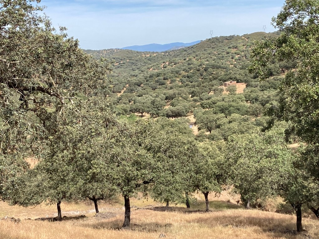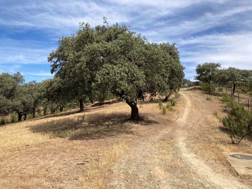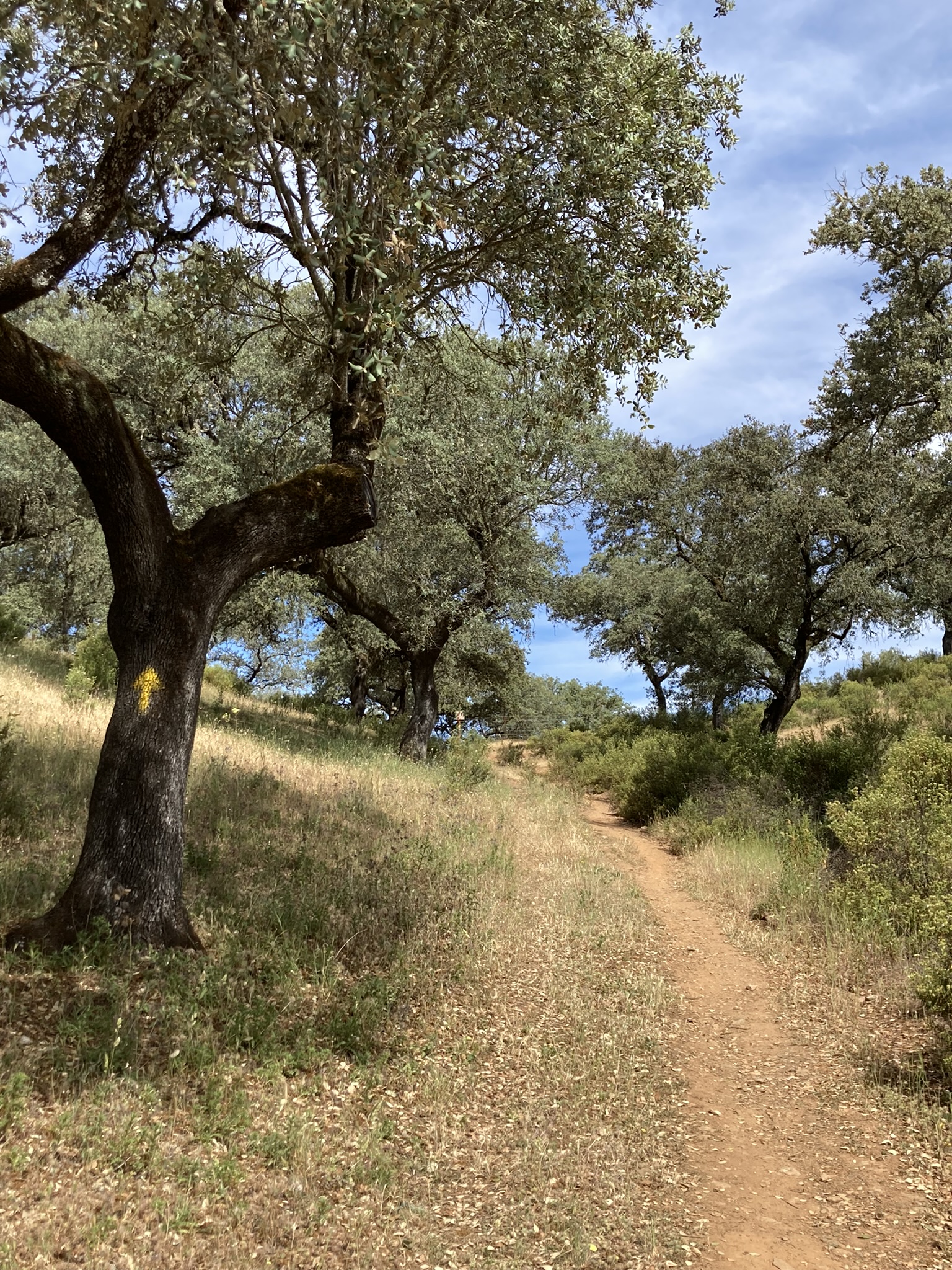 Meine Unachtsamkeit und der späte Entschluss zur Umkehr kosten mich am Ende zwei Stunden. Ich muss ein ganzes Stück an der Straße zurückgehen, dann einen steilen Anstieg hinauf. Als ich endlich den ersten gelben Pfeil sehe, bin ich froh, dass ich zurückgegangen bin. Der Weg führt durch eine Landschaft mit Kork- und Steineichen, scheinbar fernab der Zivilisation. Die Zeit ist nun allerdings schon recht weit fortgeschritten, die Sonne brennt wieder gnadenlos und ich muss erst einmal einen steilen Abstieg überwinden, der mir und meinem noch nicht ganz wieder hergestellten Fußgelenk viel Konzentration abverlangt.