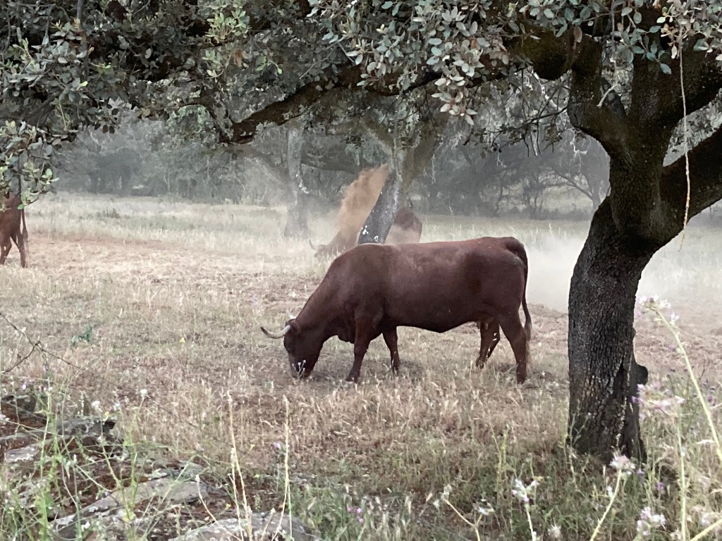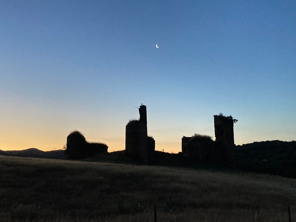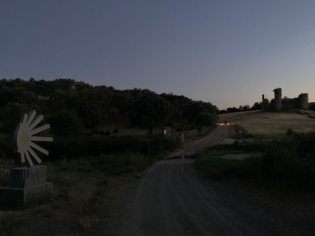 Es ist noch dunkel. Der Weg die Straße hinunter geht in eine Fahrpiste über. Nach etwa zwanzig Minuten erreiche ich den kleinen Bach Arroyo de la Vibora, der zugleich die Grenze zwischen Andalusien und Extremadura markiert. Es ist kaum Wasser in Flussbett. Geradeaus erhebt sich in der Morgendämmerung still und märchenhaft das mittelalterliche Castillo de las Torres. Die Türme sind von Störchen besetzt. Früher diente das Castillo vermutlich zur Sicherung des Weges und als Herberge.