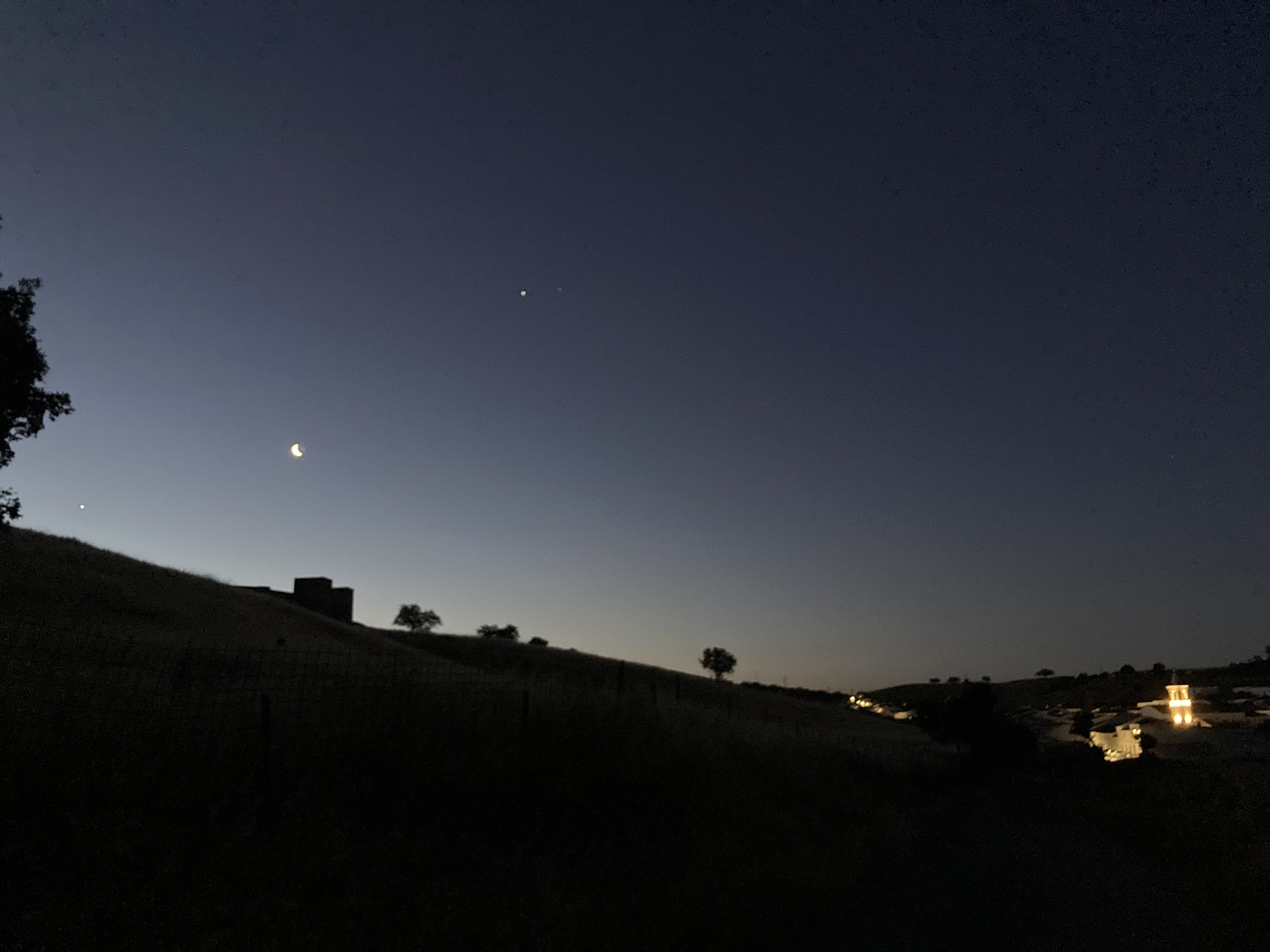 Es ist noch dunkel. Der Weg die Straße hinunter geht in eine Fahrpiste über. Nach etwa zwanzig Minuten erreiche ich den kleinen Bach Arroyo de la Vibora, der zugleich die Grenze zwischen Andalusien und Extremadura markiert. Es ist kaum Wasser in Flussbett. Geradeaus erhebt sich in der Morgendämmerung still und märchenhaft das mittelalterliche Castillo de las Torres. Die Türme sind von Störchen besetzt. Früher diente das Castillo vermutlich zur Sicherung des Weges und als Herberge.