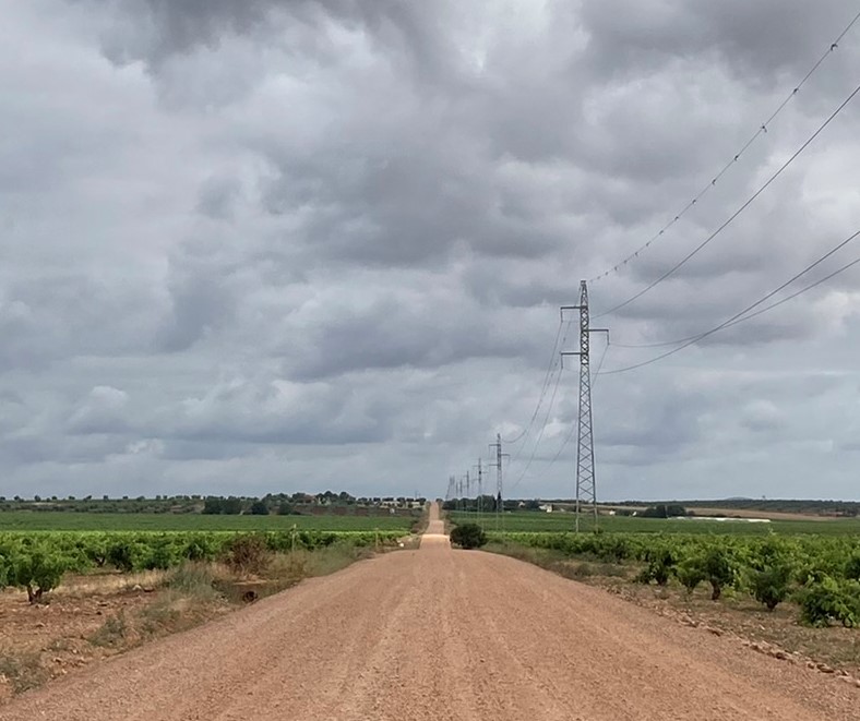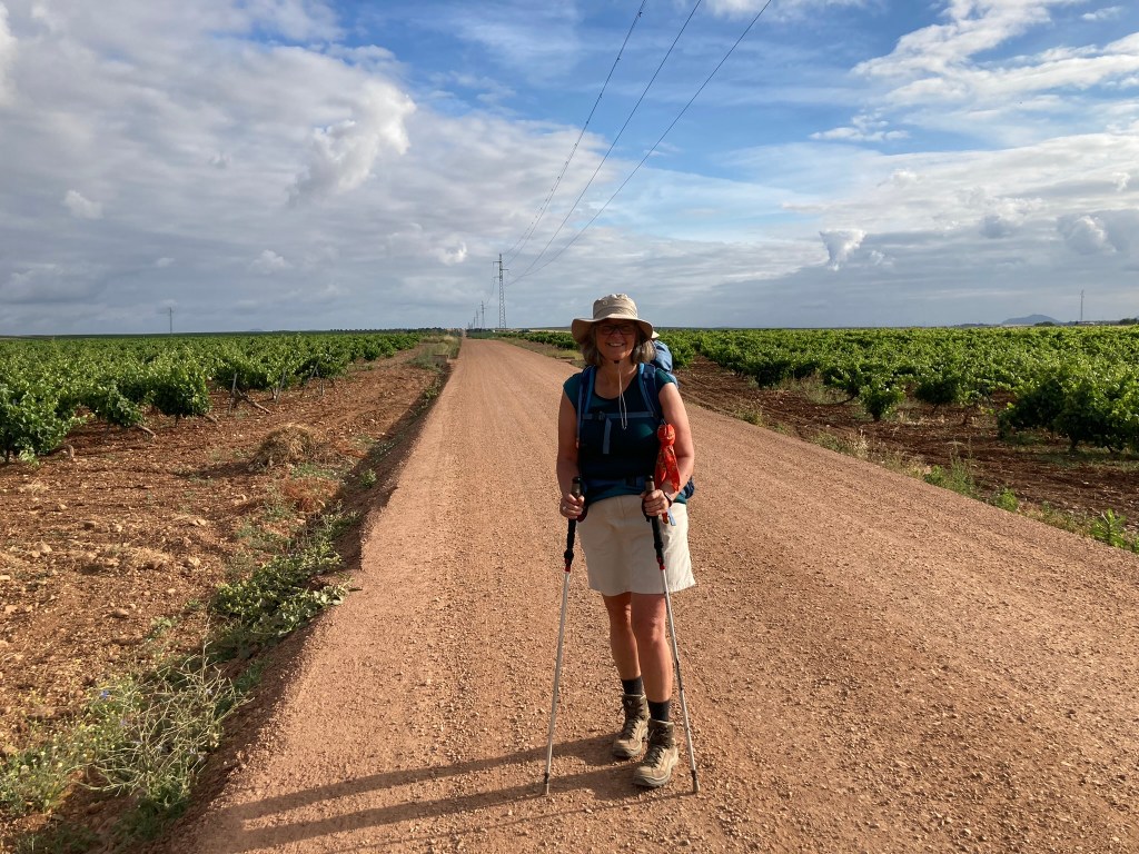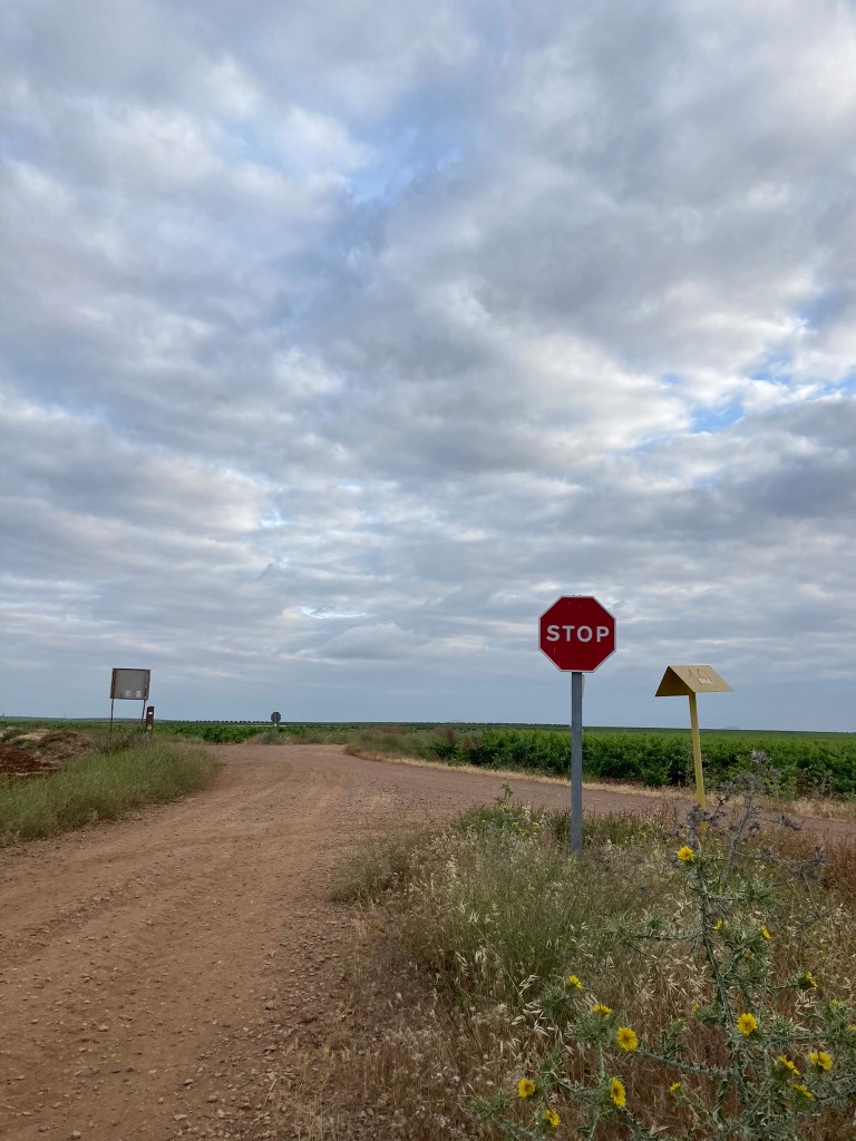 Der Rother Guide hat vorgewarnt, dass diese Etappe ausgesprochen öde sein soll und sagt, dass einen später nichts mehr erschüttern kann, wenn man die Strecke hinter sich gebracht hat. Ich kann das so nicht bestätigen. Die Strecke ist etwas eintönig, aber längst nicht so öde wie viele andere Etappen, die sehr viel später kommen. Und nach nur neun Tagen und bisher wenigen langen Geraden kann ich der wie am Lineal gezogenen Linie noch etwas abgewinnen. Mal abgesehen davon, dass der feine Kies auch freundlich zu den Füßen ist. Auch das soll sich später deutlich ändern.