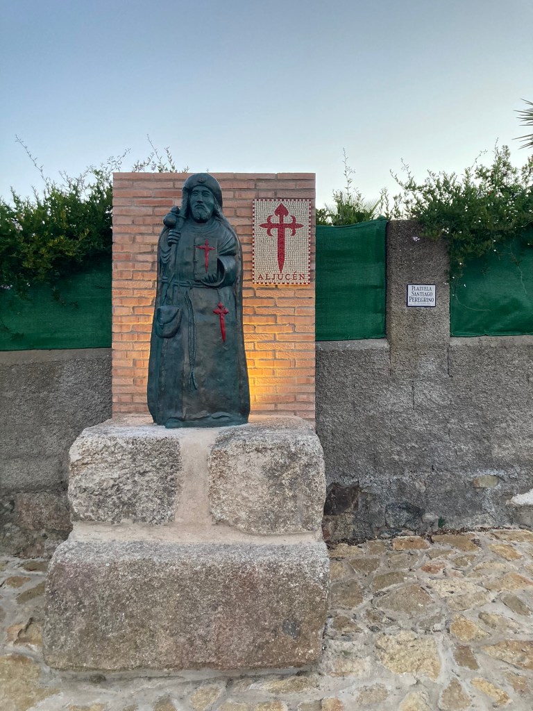 In Aljucén, das man, kaum hat man die vierspurige Schnellverkehrsstraße passiert, nach weiteren zehn Minuten erreicht, emfängt die Pilgerin mit einer Jakobusstatue. Wenigstens das ist keine Täuschung. Jakobus ist immer zugegen und diese Konstante ist es vielleicht, die mir auf den Wegen immer wieder Mut zum Weitergehen macht. Jakobusstatuen, gelber Pfeil, Muschel. Sie vermitteln mir ein Lebensgefühl, das von Beständigkeit, Vertrauen und Freude geprägt ist. Und wer kennt nicht das plötzliche Glücksgefühl, das einen ereilt, wenn man zu Hause in Deutschland auf ein Muschelzeichen stößt. Plötzlich ist man dann auch in Deutschland wieder mitten auf dem Camino.