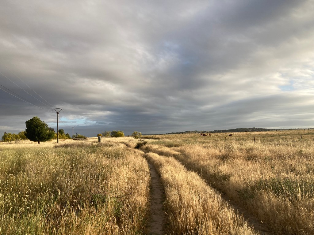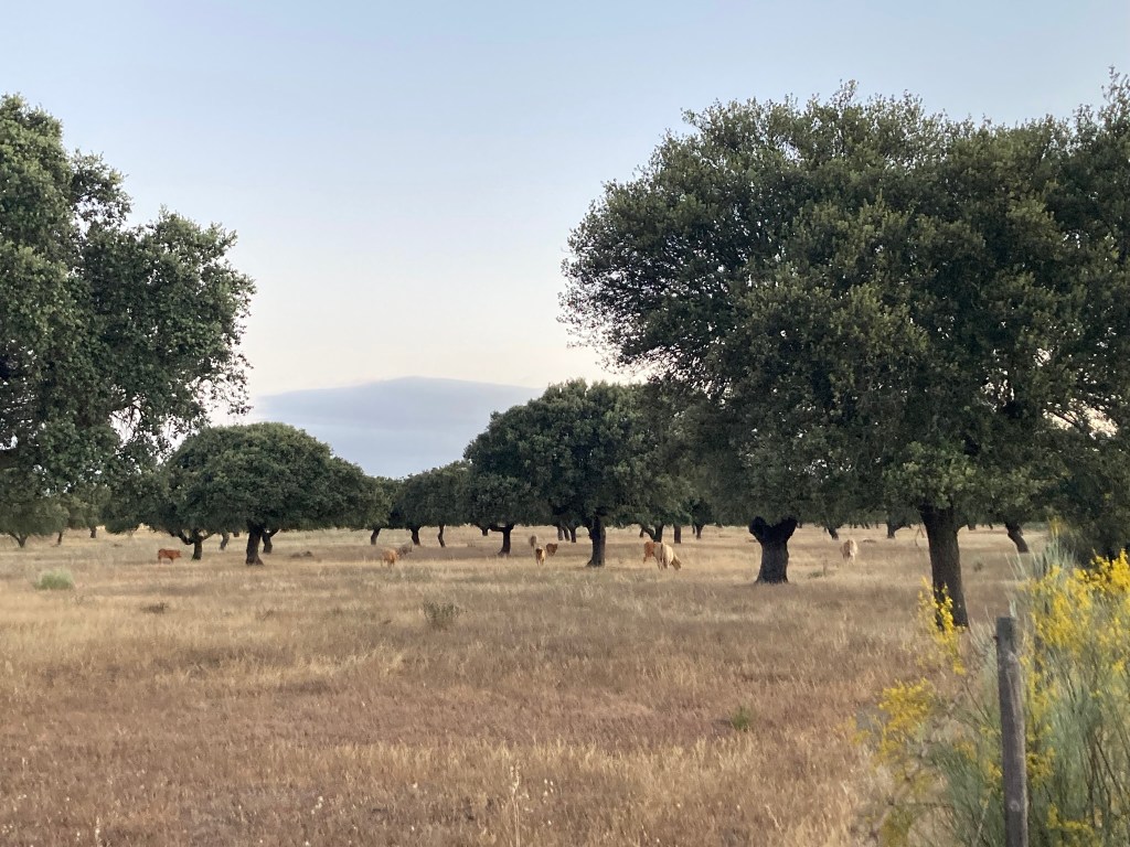 Nach etwa zwei Stunden durch die savannengleiche Landschaft mit friedlich grasenden Kühen und Schafen trifft der Weg wieder auf die Calzada Romana. Und damit finde ich auch wieder die Fußspuren meines Pilgerfreundes Gorazd, mit dem ich mich heute in Cáceres treffen möchte. Für mich bedeutet das eine lange, Respekt-einflößende Tagesetappe von achtunddreißig Kilometern.