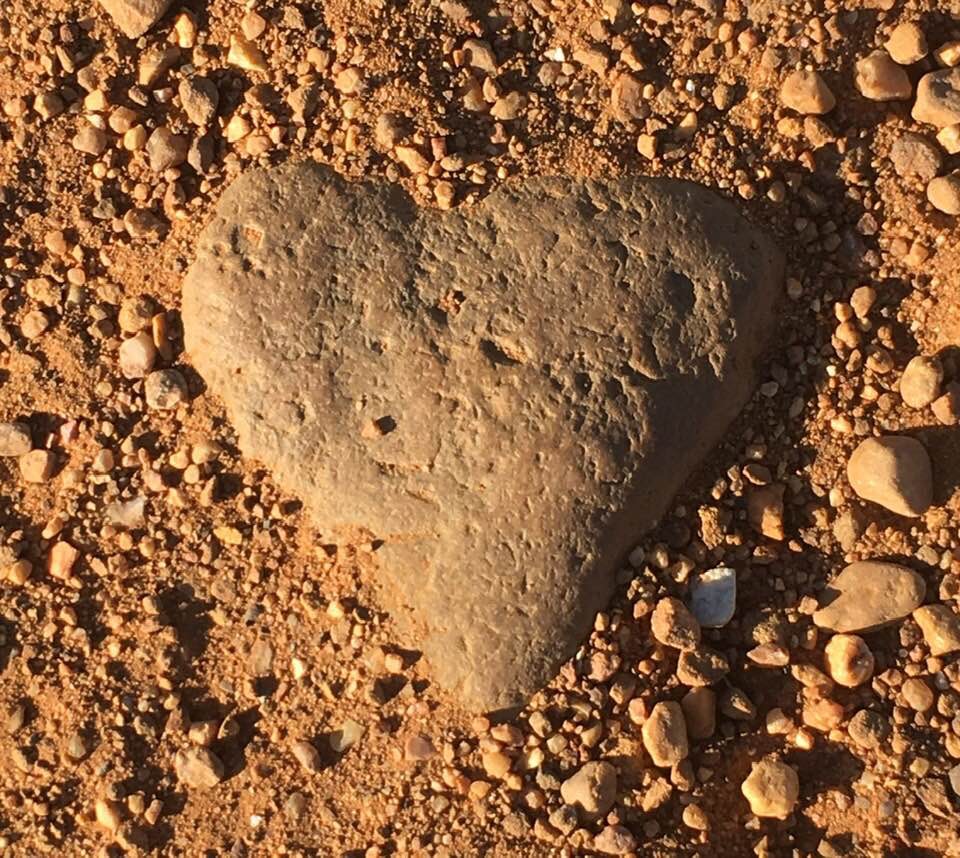 Steine auf dem Weg erinnern uns an unsere eigene Körperlichkeit. Sie stellen ein Gegengewicht her zu unserem Wunsch nach Befreiung, nach Leichtigkeit. Die steinigen Pisten des Pilgerwegs sind zuweilen sehr mühsam zu bewandern. In manchen kargen Gegenden gibt es nichts als die Stein gewordene Wirklichkeit des Weges. Schotterpisten soweit das Auge reicht, geformt von den Schritten zahlloser Pilger. Eingegraben in die Erde und wieder freigelegt durch die Reibung von festem Schuhwerk treten neue Formen zutage. Ich kannte eine Pilgerin, die ein ganzes Album voller Herzsteinbilder auf ihrem Smartphone gespeichert hatte, einer schöner als der andere. Und auch hier zeigt sich die Wandelbarkeit der Welt, denn was heute wie ein Herzstein erscheint, wird morgen durch weitere Fußtritte vielleicht schon wieder vergraben sein.