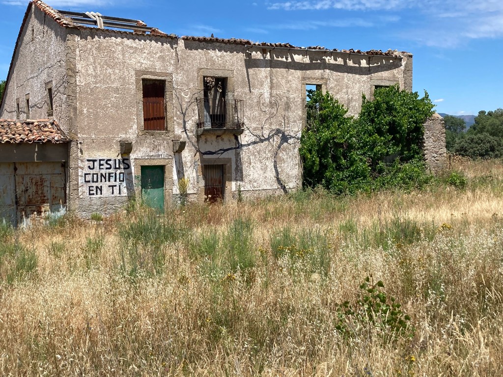 Ich streife mir als Sonnenschutz meine weißen Ärmlinge über. Ein Blick in meine Trinkblase gibt mir die Gewissheit, dass ich noch genügend Wasservorräte habe. So eine Trinkblase hat zwei entscheidende Vorteile: Erstens kann ich zwischendurch immer trinken, ohne den Rucksack absetzen zu müssen. Und zweitens ist der Trinkbehälter zwischen meinem Rücken und dem Rucksack so gut isoliert, dass das Wasser auch bei hohen Außentemperaturen eine angenehme Trinktemperatur behält. Trotzdem fühlt sich meine Zunge dick an. Ich lechze nach etwas Kaltem, das meinen aufgeheizten Körper runterkühlt. Am Ende einer mehrere Kilometer langen Asphaltstraße lese ich an einem Haus „Jesús confio en tí“, und interpretiere in Ermangelung verlässlicher Spanisch-Skills und angesichts meiner Erschöpfung nach zwischenzeitlich dreißig Kilometern in den Beinen, dass Jesus an mich glaubt. Diese Fehlübersertzung ist mein Glück; denn mit meinem eigenen Glauben käme ich gerade nicht mehr sehr weit. Dass jemand anderes mir das Ankommen heute noch zutraut erscheint mir sehr tröstlich und gibt mir Kraft und Zuversicht.