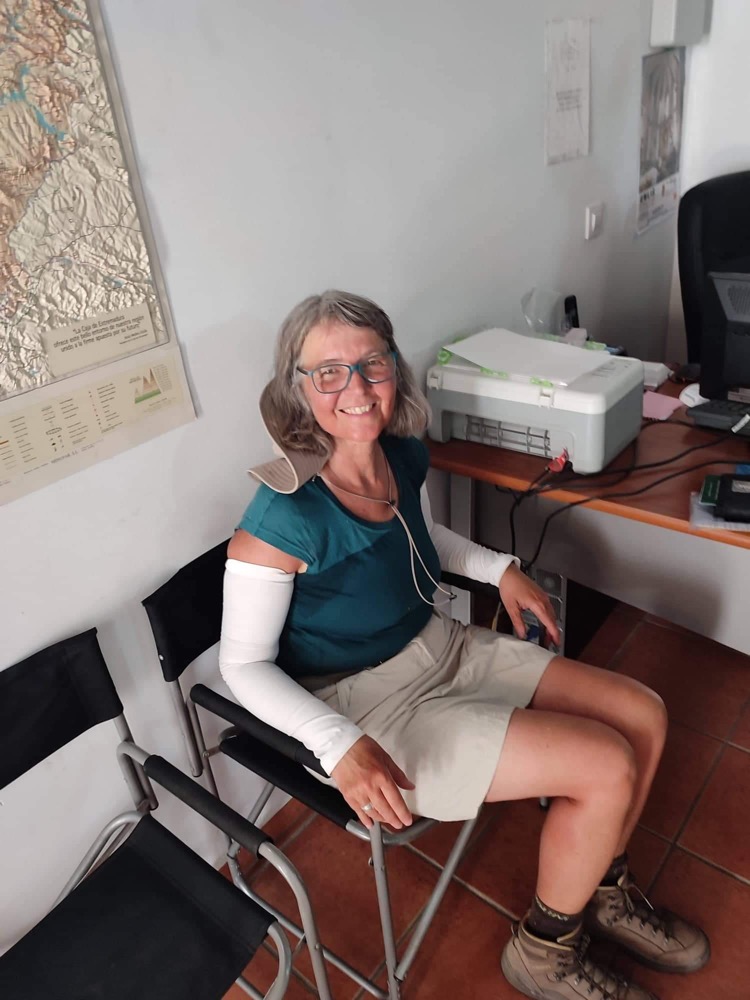Als ich endlich die ersten Häuser von Aldeanueva erreiche, muss ich mich aus Erschöpfung erst einmal auf einem Mäuerchen in den Schatten setzen, bevor ich die letzten paar hundert Meter bis zur Herberge zurücklege. Als ich die Tür zur rettenden Unterkunft aufstoße, stelle ich fest, dass Gorazd auch eben erst angekommen sein muss. Er schiebt mir den Stuhl an der Rezeption unter den Po, und ich lasse mich einfach stumpf daraufplumpsen. Jemand besorgt mir aus dem Getränkeautomaten ein Zischgetränk. Es dauert einige Minuten, bis ich mich soweit erholt habe, dass ich den üblichen „Haushalt“ machen kann: Bett beziehen, Duschen, Wäsche waschen.