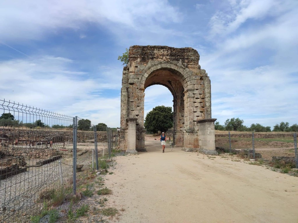 Markanter Mittelpunkt nach etwa zwanzig Kilometern ist heute der Arco de Cáparra, das vierbogige Tor einer niedergegangenen römischen Stadt an der wichtigen Handelsstraße zwischen Astorga und Melide. Die Ausgrabungsstätte kann man normalerweise besichtigen, und zwar an wohl jedem Tag außer montags. Dann würde man auch einen Getränkeautomaten dort finden, der ein Zischgetränk bereithielte. Aber heute ist Montag. Es bleibt also nichts als eine Fotosession mit Peregrino Gorazd und ein paar Radfahrern, die sich zur selben Zeit dort einfinden.