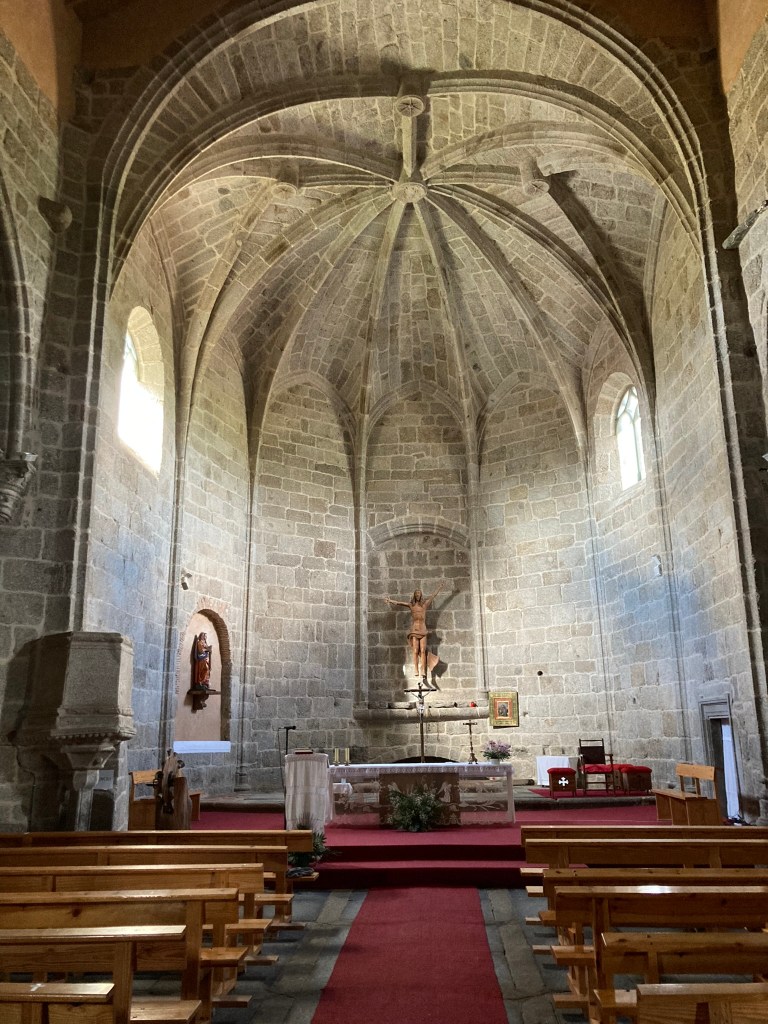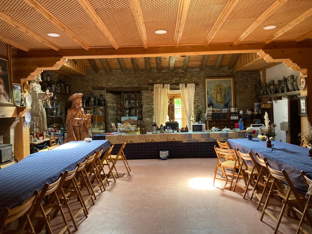 Vor dem Abendessen dürfen wir alle gemeinsam die Kirche besichtigen, das Abendessen bekommen wir im großen dunklen Speisesaal kredenzt. Eigentlich ein schönes Ereignis, aber wir scheinen alle ein wenig mit der Situation zu fremdeln: Der Speisesaal ist riesig, der Trödel an der Wand schüchtert ein und es wirkt alles in allem weder gemütlich noch sonderlich sauber. Und es ist kalt in dem Gemäuer. Es will kein rechtes Gespräch aufkommen, von ausgelassener Stimmung, wie ich sie sonst von solchen Abendessen auf dem Camino kenne, keine Spur. Aber wir wir bekommen ein sättigendes, einfaches Essen. Und für mich werden sogar nochmal extra ein paar Eier in die Pfanne gehauen, weil ich keinen Fisch essen kann.