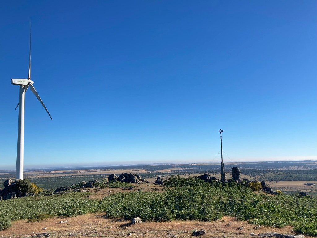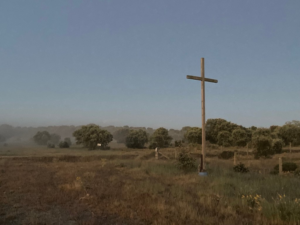 Allmählich steigt der Weg an, hinauf auf den 1150 Meter hohen Pass der Sierra de la Dueña. Kurz vor dem Santiago-Kreuz überholen mich – wie soll es anders sein – Anna und Arth und der Spanier. Der Spanier und ich sind wohl die einzigen, die die Aussicht vom Kreuz oben genießen. Ich lasse meinen Rucksack unterhalb des Kreuzes liegen, was ein wenig unvorsichtig ist, weil sich darin auch Geld und Ausweis befinden. Von oben hat man einen atemberaubenden Rundblick. Ich bin eine ganze Zeitlang allein da oben, der Spanier ist schon weg. Und als ich dann nach einiger Zeit mich endlich zum Abstieg wende, sehe ich den Spanier, der in der Zwischenzeit auf meine Sachen aufgepasst hat. Er winkt mir zum Abschied, als er sieht, dass ich jetzt wieder selber meinen Rucksack im Blick habe. So ist das oft auf dem Weg. Man braucht keine Worte für das Wesentliche. Ganz selbstverständlich gibt man aufeinander acht.