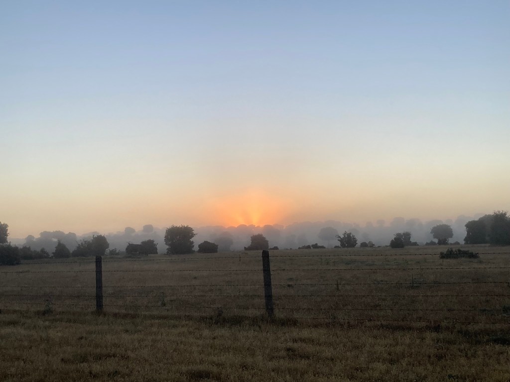 Der heutige Tag verspricht großartig zu werden. Ich laufe mitten hinein in einen grandiosen Sonnenaufgang, dessen Licht durch Nebelschwaden gebrochen wird. Rundherum muht, quakt, grunzt und vibriert die erwachende Natur. Die Vögel legen die Melodie darüber und ich lache vor Glück und fange trotz des schweren Rucksacks an zu hüpfen. Es gibt Tage, da kann kommen, was will. Da spürst Du das Gewicht nicht und es ist Dir leicht ums Herz. So einer ist heute. – Oder sagen wir besser: So einer ist heute früh.
