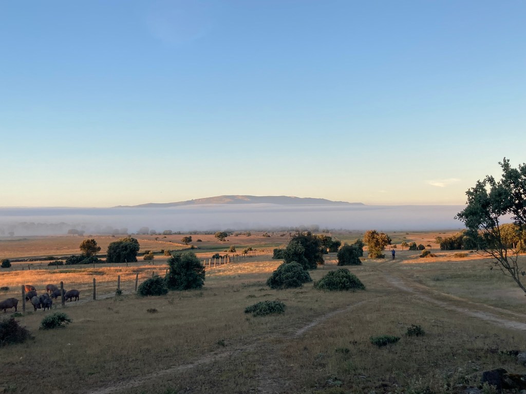 Wider erwarten habe ich geschlafen wie ein Murmeltier. In dem kalten, mit Gerümpel vollstehenden Speisesaal der Herberge in Fuenterroble gibt es ein reichhaltiges Frühstück, das ich so noch gestern Nachmittag nicht erwartet hätte. Die Napolitana, die ich am Vortag im kleinen Lebensmittelmarkt gekauft habe, reicht mir völlig. Ich nehme mir ein Ei für unterwegs und einen Kaffee. So richtig Frühstückslaune mag nicht aufkommen. Ich kaue schweigend und betrachte all das ganze Messiezeugs und die vielen schlechten Bilder an der Wand. Ein Bild kopiert da Vincis „Abendmahl“. Einer der Jünger ist mit dem Gesicht von Ex-König Juan Carlos I dargestellt; es könnte auch der Bruder unseres spanischen Mitpilgers sein.