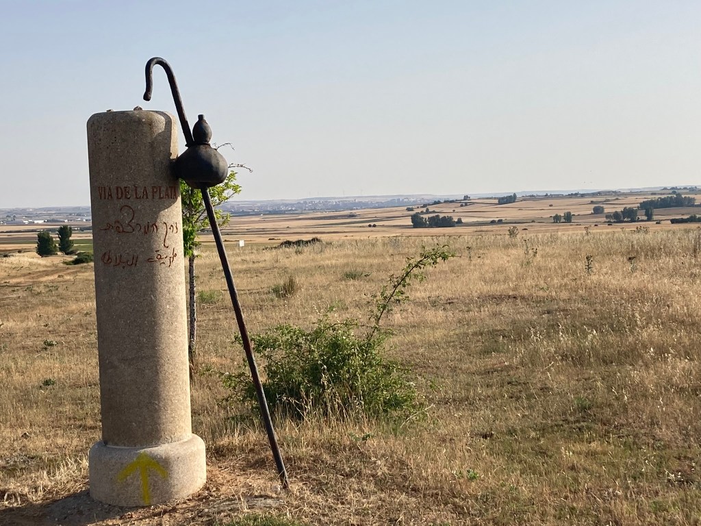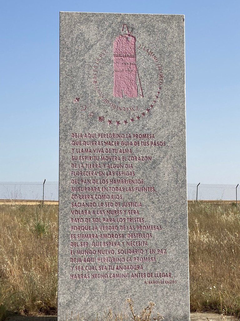 Am Brocal de las Promesas teilen wir uns ein paar Kekse und Mandarinen. Das Denkmal für Frieden und Religionstoleranz wurde von der Asociación de Amigos del Camino de Santiago de la Vía de la Plata dort errichtet. Es besteht aus drei Stein-Monolithen von je vier Metern Höhe und einem Brunnen, in dem die Pilger, wie ich später erfahren habe, ein Gelübde ablegen sollen und zum Zeichen ihres Anliegens einen Stein versenken können. Leider ist der Brunnen ausgetrocknet und ganz offensichtlich auch zuletzt mit einem Mülleimer verwechselt worden.