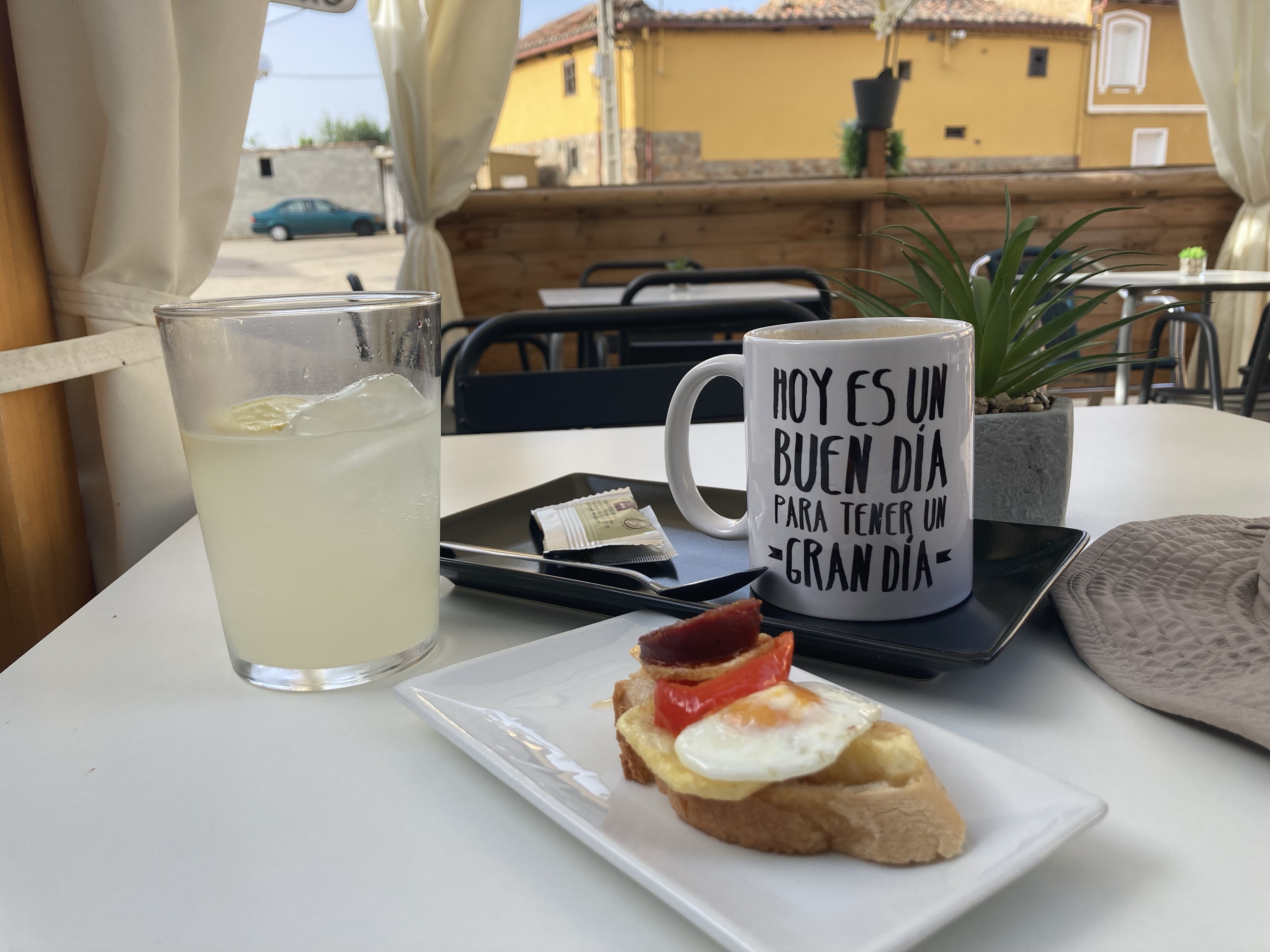 In Villanueva de las Peras gibt es eine Bar, die selbst nach Frankfurter Maßstäben modern ist. Die Toiletten sind auf dem neuesten Stand, die Türen lassen sich schließen, es gibt Seife am Waschbecken. All das ist in der Meseta nicht selbstverständlich. Es gibt feine Tapas, eine Kas de Limón und einen Café con Leche, serviert in einer Tasse mit der Aufschrift „Heute ist ein guter Tag, um einen großartigen Tag zu erleben“. Na, wenn das nicht verheißungsvoll ist!