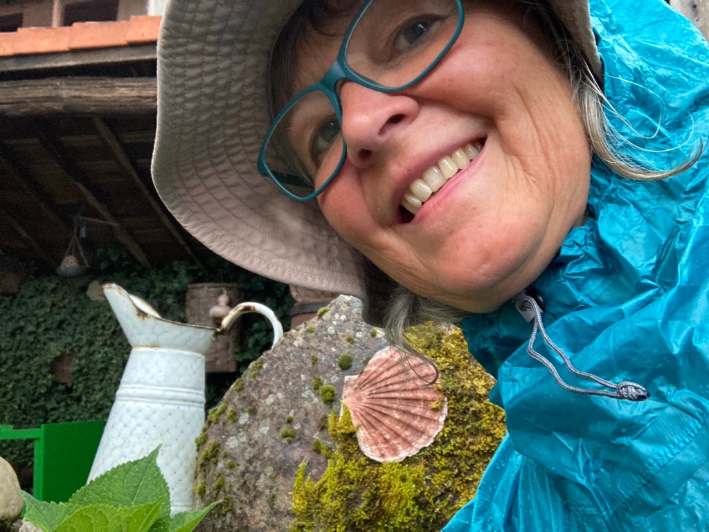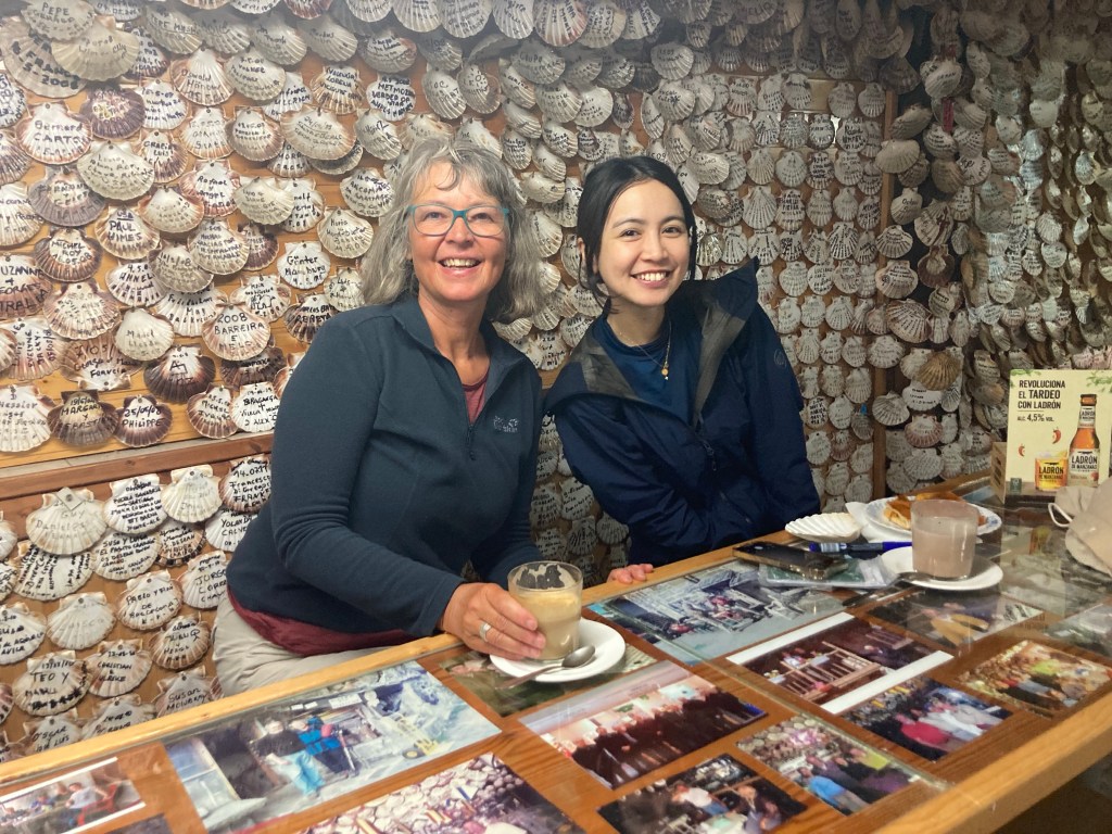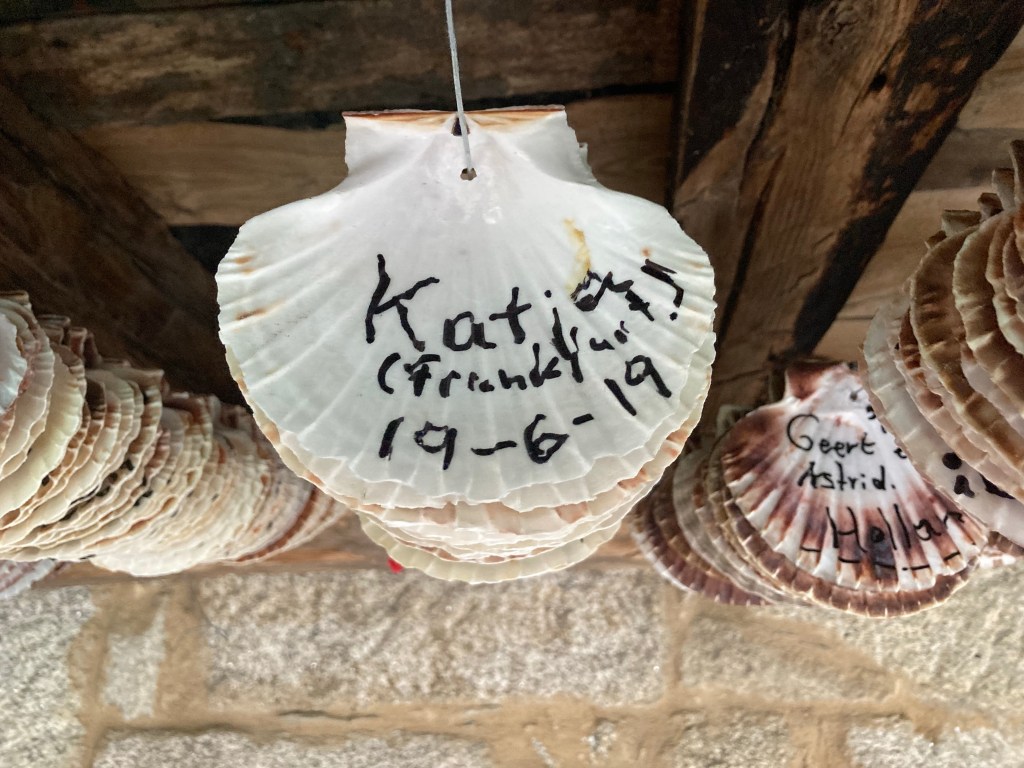 Wir haben Glück. Die Bar ist geöffnet. Ich trete ein. Jeder Quadratzentimeter ist von Millionen Jakobsmuscheln bedeckt, die alle Inschriften tragen. Auch ich habe vor drei Jahren eine Muschel beschriftet. Es gibt Empanadas und Café con Leche. Quinn leistet mir Gesellschaft. Nachdem ich einigermaßen gestärkt bin, frage ich den Wirt, ob sich wohl meine Muschel wiederfinden lässt. Kein Problem für ihn, sofern ich weiß, an welchem Tag ich da war. Ich denke nach und kann mich ziemlich genau erinnern, weil Tage auf dem Camino selten bedeutungslos sind. Er winkt mir, dass ich mitkommen soll und geht mit mir auf die andere Straßenseite in die Herberge. Und tatsächlich: Er braucht nur wenige Griffe, um mich zu meiner Muschel zu führen. Das unverhoffte Wiedersehen mit diesem Gegenstand berührt mich.