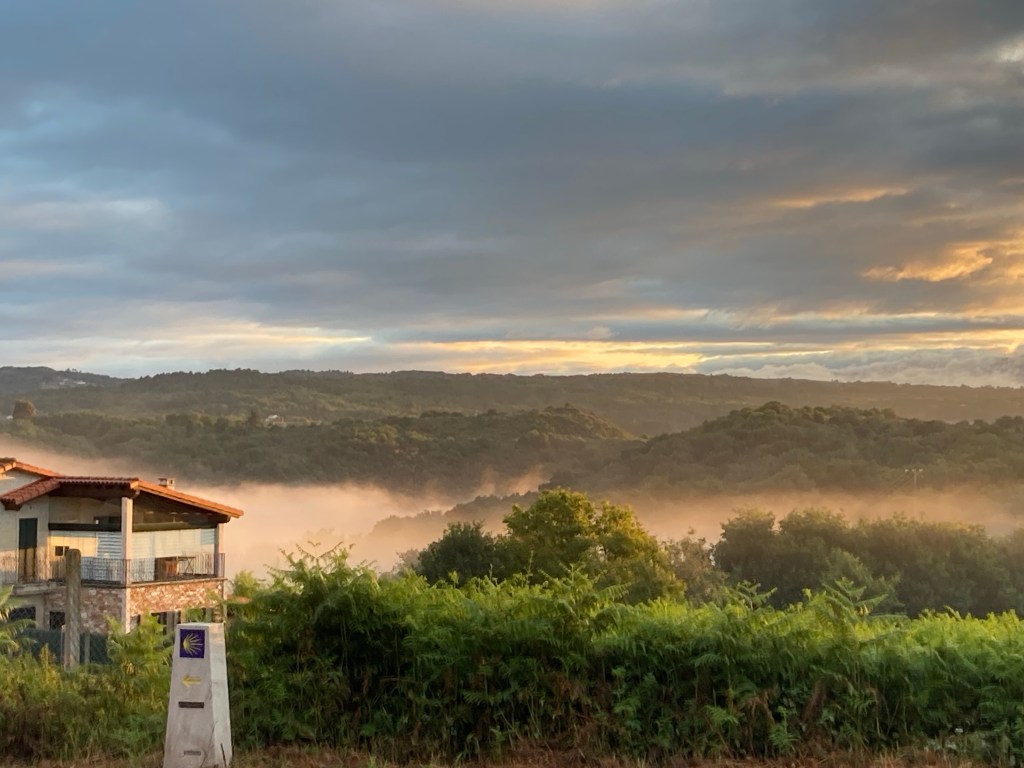 Der Weg aus Laza folgt der Straße, führt an einigen kleinen Ortschaften vorbei, um dann hinter Tamicelas steil bergauf zu führen. Die Luft dampft und scheint gar keine Feuchtigkeit mehr aufnehmen zu können. Unter dem Poncho wird es klamm vom Schweiß. Einen Schritt vor den anderen auf dem glitschigen Weg. Einen Schritt vor den anderen. So setze ich den Fuß schließlich auf die Landstraße, die sich nach einem weiteren Kilometer in die kleine Ortschaft Alberguería ergießt. Der Himmel reißt auf, ich reiße die Kapuze vom Kopf und setze meine Brille wieder auf, die ich in der Tasche verstaut hatte, weil sie mir in der Feuchtigkeit ohnehin keine Hilfe mehr war.