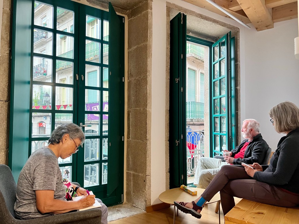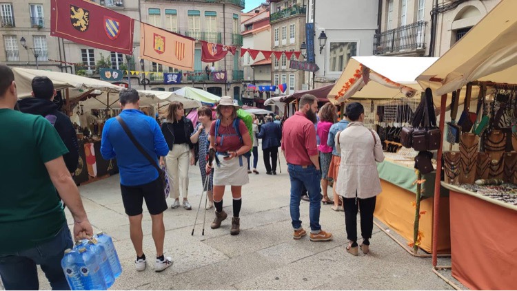 Auf der langen Geraden, die nach Ourense hinein führt, holt Gorazd mich mal wieder ein. Meine erkältungsbedingte Müdigkeit ist verflogen, so dass ich heute Nacht doch in der Herberge schlafen kann. Als wir bei dem schön renovierten Natursteinhaus um die Ecke biegen, bietet sich uns ein lebhaftes Bild. Vor der Herberge werden unsere Pilgerfreunde gerade von einem Team der Lokalzeitung interviewt. Ja, man scheint sich daran zu freuen, dass die Pilger nach der Pandemie zurück sind. Wir sind ein bedeutender Wirtschaftsfaktor.