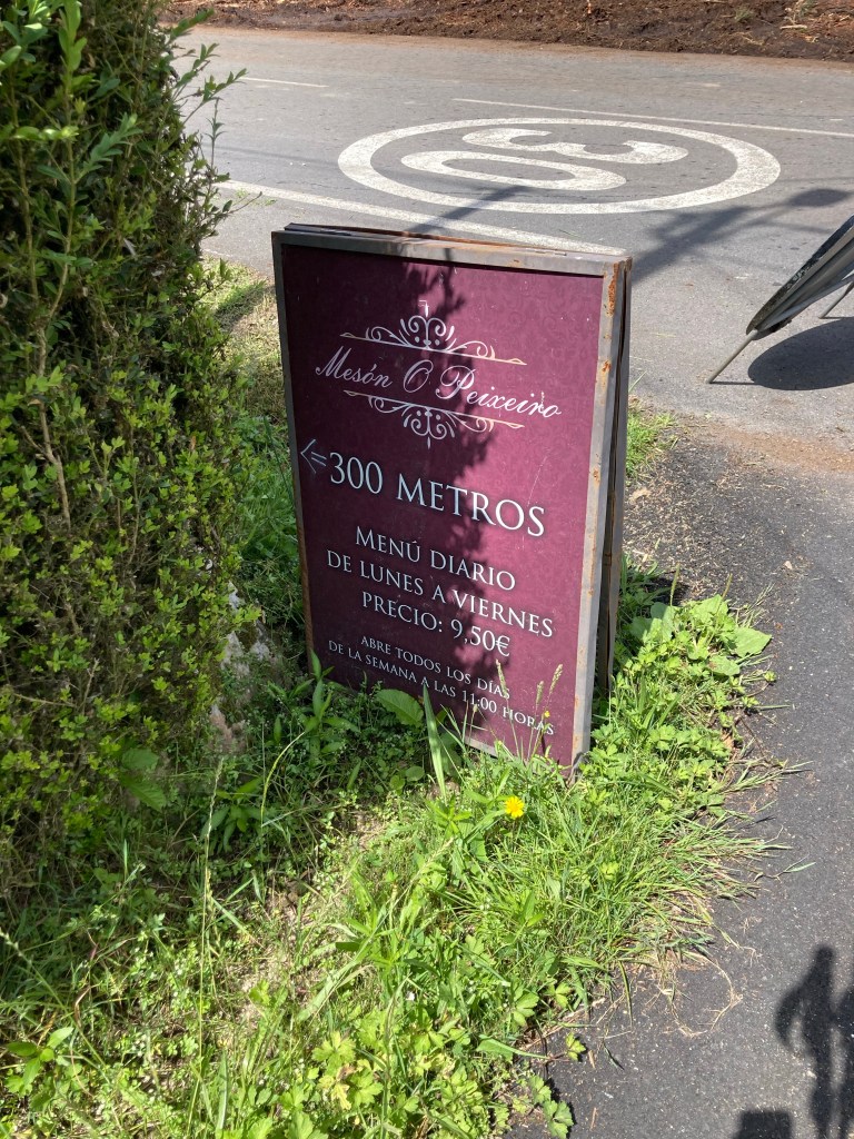 Eine weitere Stunde später in A Carballeira schließlich ein Hinweisschild auf ein Restaurant. Zum „Meson O Peixeiro“, dem Fischerhaus, sind es nur dreihundert Meter abseits des Weges. Nun ja, der Name des Lokals hört sich für mich als Fisch-Allergikerin nicht gerade vielversprechend an. Aber wo es weit und breit nichts gibt, ist die Hoffnung immer im Gepäck. Also hin!