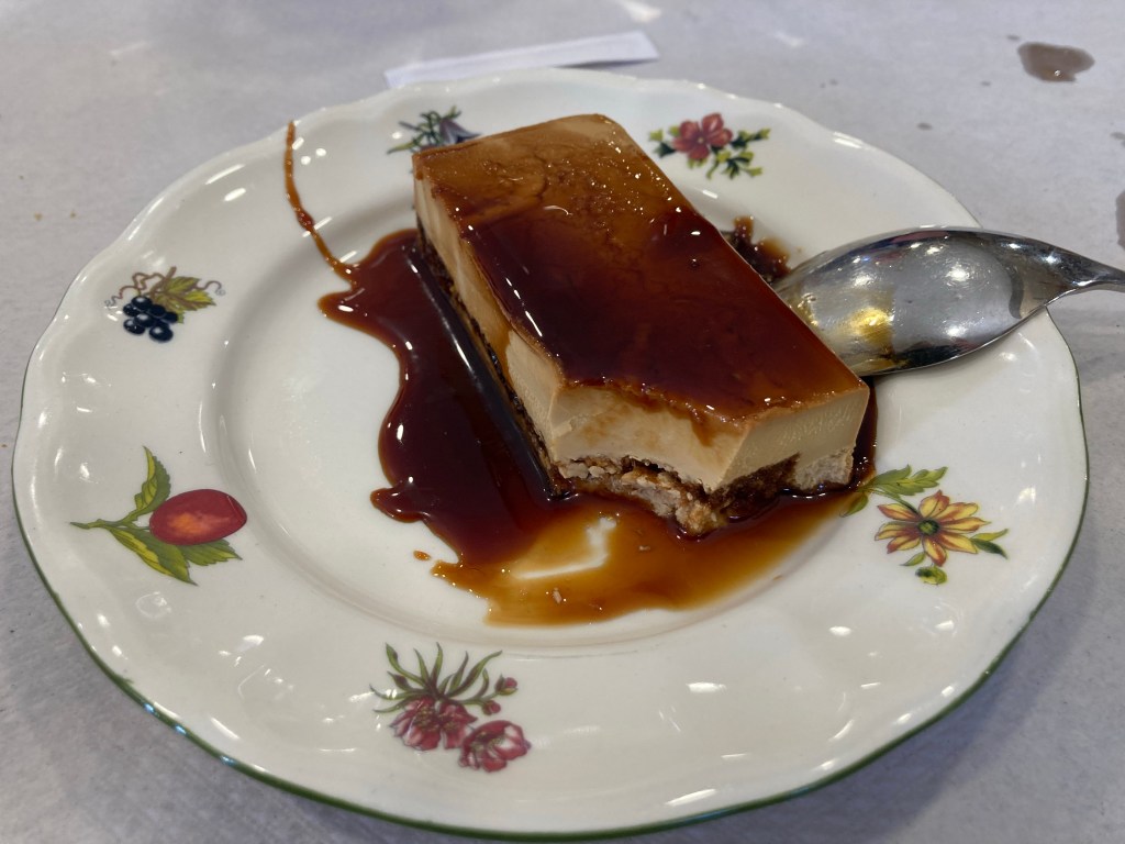 Gerade richtig zur Mittagszeit, um viertel nach eins, komme wir dort an. Jede Menge Arbeiter verbringen dort ihre Mittagspause. Keine Spur von Pilgern. Touristen selbstverständlich auch nicht. Das Menu del Día bietet keinerlei Fisch an. Es gibt Tomate mit Spargelsalat, Hühnchen mit Patatas und den besten hausgemachten Flan seit Sevilla. Und weil wir nicht alles auf einmal verputzen können, bekommen wir noch ein auslaufsicheres Doggy-Bag mit auf den Weg.