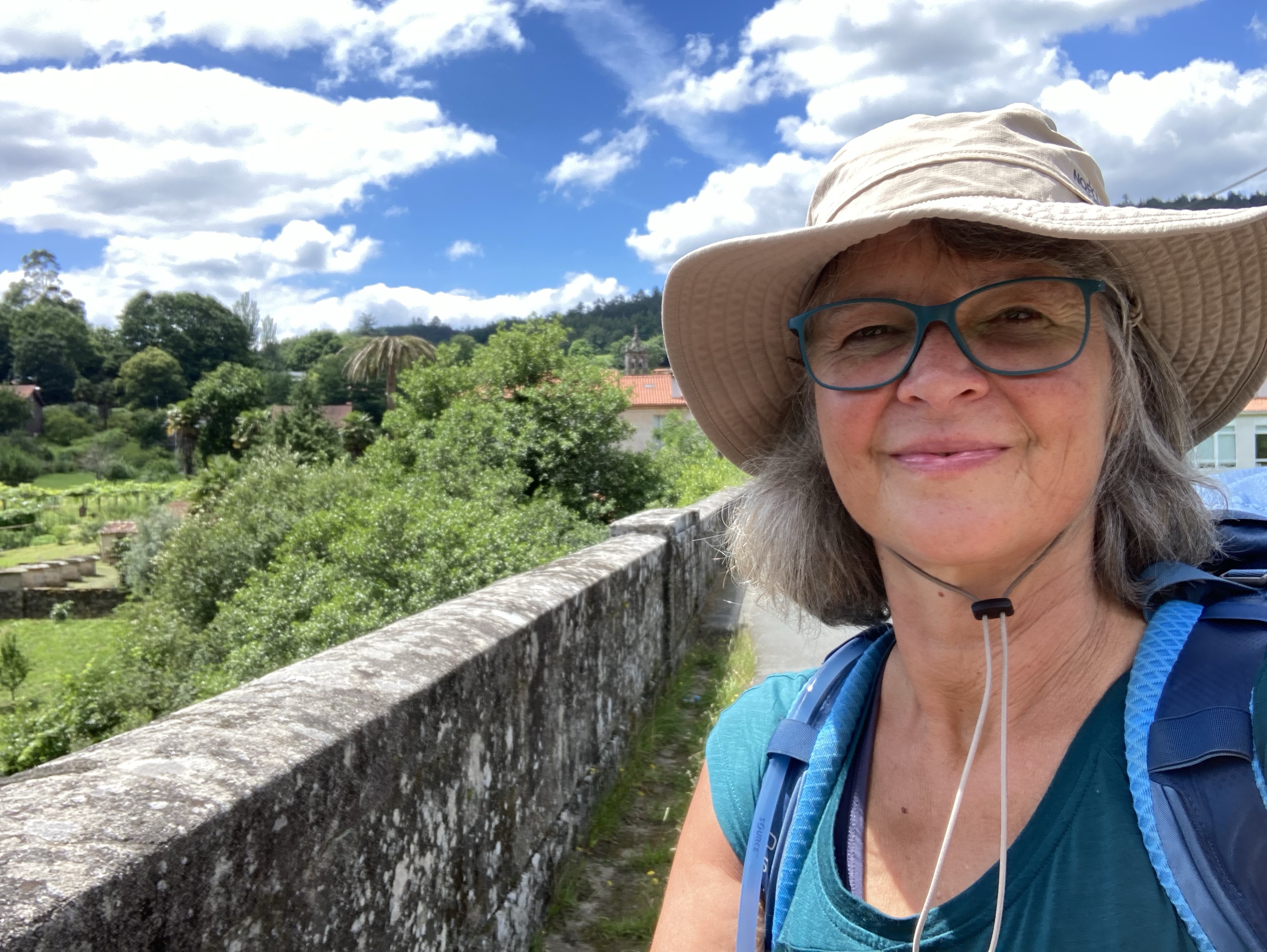 Dann rollen wir steil abwärts nach Ponte Ulla. Mein Fußzeh krampft wieder und ich muss immer wieder eine kurze Pause einlegen. Im Ort unten gönnen wir uns eine Pause. Wir sind mittlerweile acht Stunden unterwegs. Aber eine Übernachtung in Ponte Ulla kommt nicht in Frage, weil wir nicht wieder eine so volle Herberge erleben möchten. Und außerdem wünschen wir uns für den nächsten Tag einen kurzen Zieleinlauf nach Santiago. Da es in dem etwa vier Kilometer entfernten Outeiro weder eine Bar noch einen Laden gibt, rechnen wir mit einer ruhigen Nacht dort. Für die meisten dürfte die Etappe in Ponte Ulla enden, zumal es danach wieder steil bergauf geht.