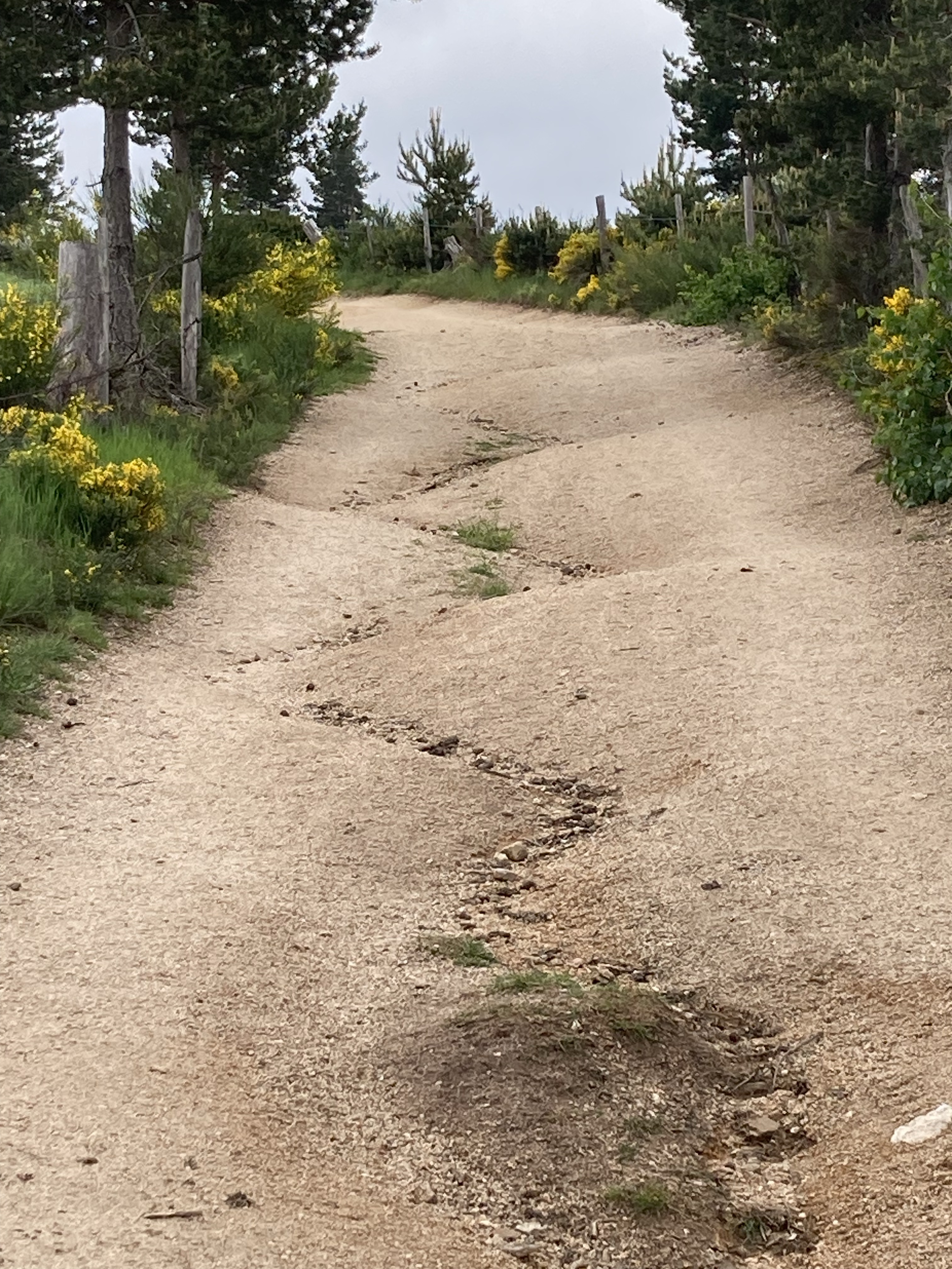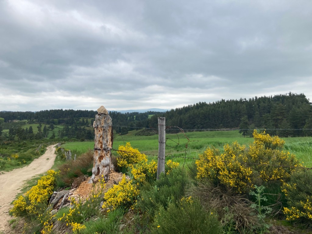 Die Landschaft wechselt ganz langsam ihr Gesicht, weißes Granitgestein hat die rote Erde ersetzt. Ansonsten überziehen grüne Wiesen, dunkelgrüne Nadelgehölze und gelber Ginster die Erde, dazwischen recken sich Margeriten dem Licht entgegen.