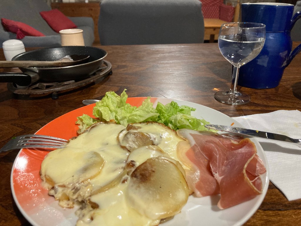 Am frühen Abend erweist sich Laurence dann doch noch als aufmerksame und nette Gastgeberin. Sie macht mir Feuer im Holzofen, nicht weil es so kalt ist, sondern weil es eine schöne Atmosphäre macht. Sie ist außerdem eine ganz begnadete Köchin und bereitet mir ein Drei-Gänge-Menü zu: Salat mit Wildkräutern, Truffade – ein Kartoffelgericht mit jeder Menge Tome-Käse, und hausgemachte Crème Brûlée. Die jungen Leute treffen auch irgendwann ein, hundemüde, weil sie den ganzen Tag in der Schmiede gestanden haben. Meine Befürchtung, dass die Party am Abend erst richtig los geht, erweist sich darum als unbegründet.