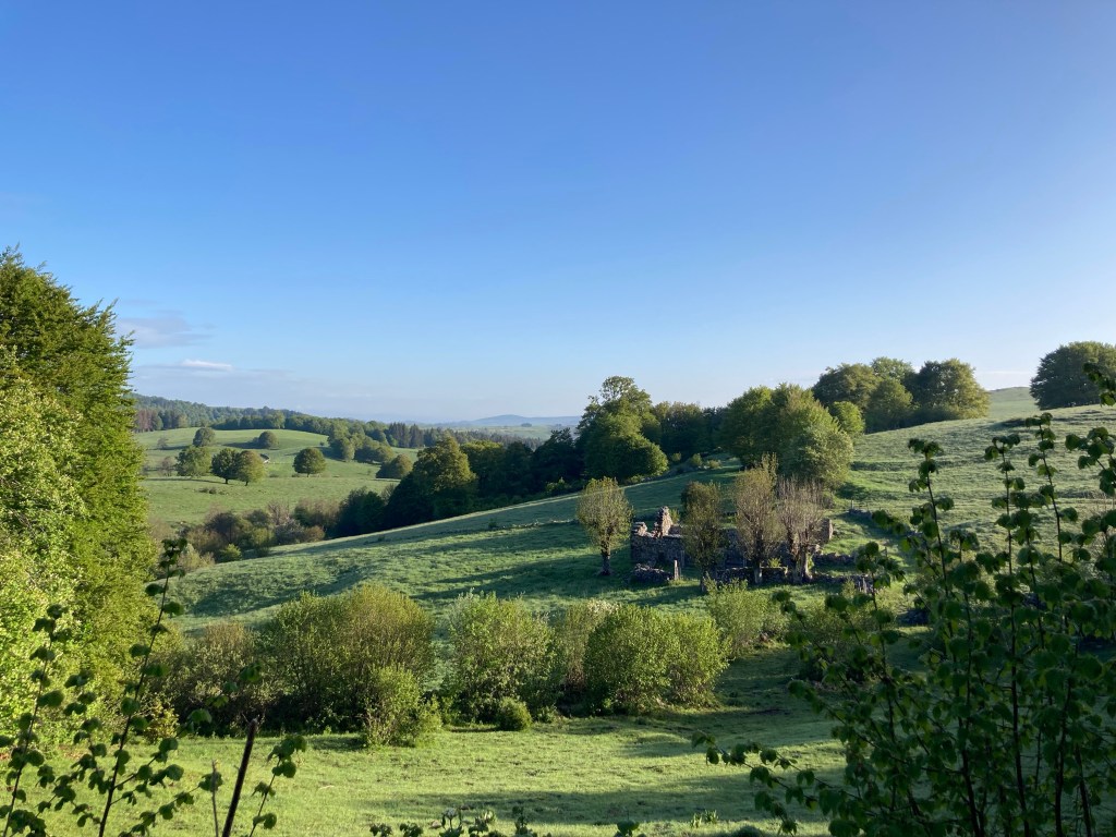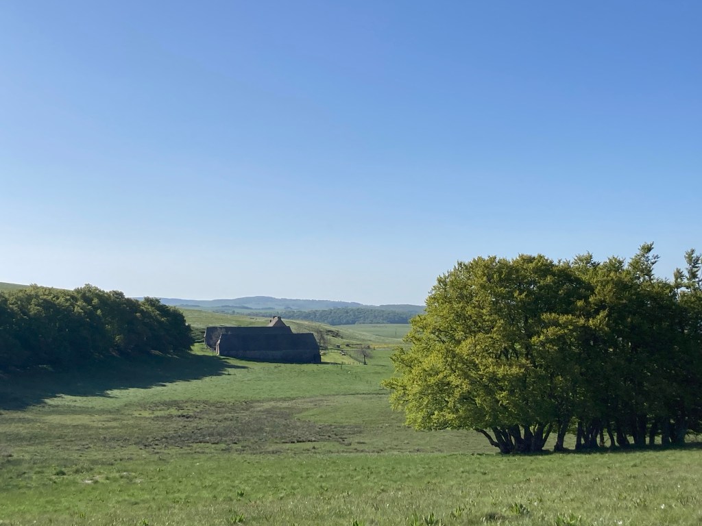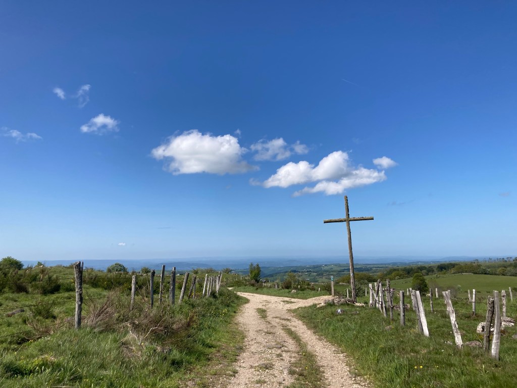 Ich hingegen erreiche Aubrac bei bester Gesundheit und gönne mir erst einmal eine Jausenzeit auf einer Bank und anschließend einen Kaffee im Touristenzentrum. Danach setze ich meinen Weg durch den kleinen, sehr überschaubaren Ort fort. Hier sind unglaublich viele Leute auf den Beinen. Und die Campingwagen sind außerhalb der Ortschaft bereits in Position gestellt. Das Viehtreiben, das dieses Wochenende seinen Höhepunkt hat, lockt jede Menge Touristen an. Auf der Landstraße quälen sich die Camper dicht aneinander vorbei, einer davon touchiert mich fast am Ellbogen; ich bin froh, als ich endlich auf den Trampelpfad, der nach Saint-Chély hinunter führt, abbiegen kann.