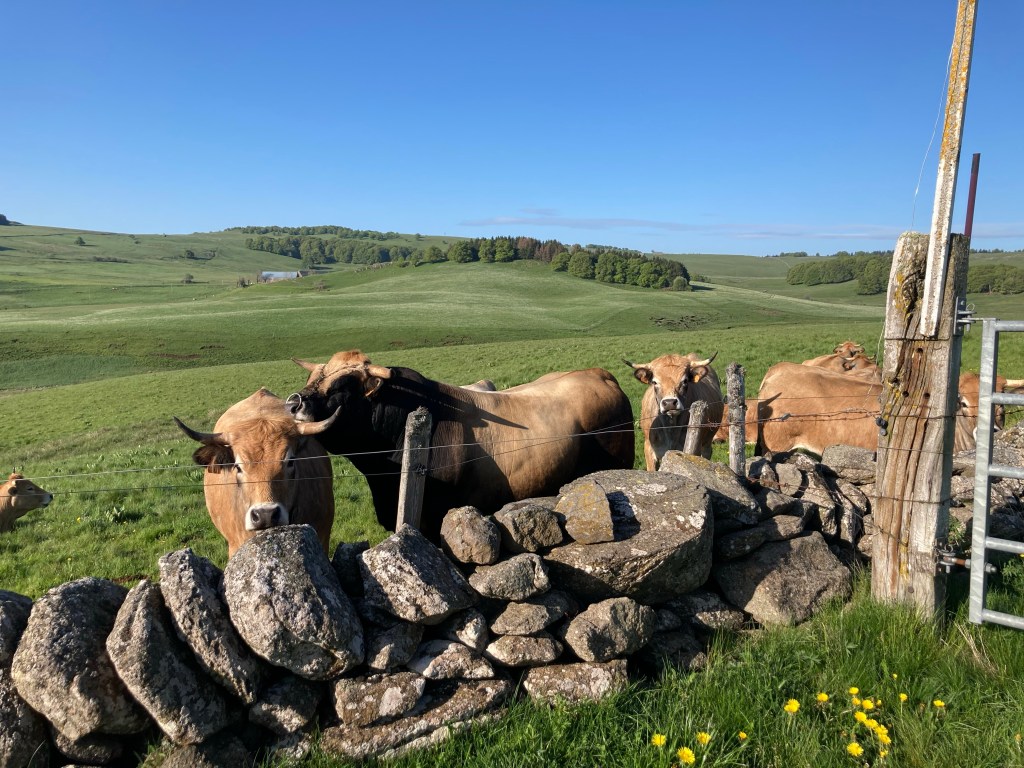 Um sieben Uhr bin ich heute auf der Straße. Eigentlich viel zu früh, denn die Herberge im nur knapp siebzehn Kilometer entfernten Saint-Chély-d’Aubrac öffnet erst um 14 Uhr. Aber ich habe den Weg über die magisch schöne Hochebene ganz allein für mich und genieße die Weite und das Alleinsein bis genau zu dem Moment, als ich Zeugin eines Naturschauspiels werde, das sich etwa zweihundert Meter vor mir scheinbar mitten auf dem Weg ereignet. Ein Bulle vergnügt sich dort fröhlich mit einer Kuh. Mein Guidebook weiß dazu zu berichten, dass Bullen im Aubrac von der Beschäftigung mit ihrer weiblichen Entourage viel zu erschöpft sind, um Menschen anzugreifen. Der aus dem Allgäu stammende Übersetzer des „Miam Miam Dodo“ muss es allerdings auch schon anders erlebt haben, denn er schreibt, man solle sich darauf nicht unbedingt verlassen. Da im Allgäu bekanntermaßen auch viele Rinder leben, gibt es für mich keinen Grund, an der Expertise des Übersetzers zu zweifeln.