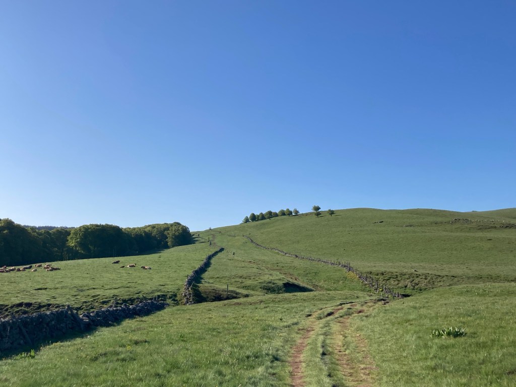 Verunsichert verlangsame ich meinen Schritt und bin augenblicklich gar nicht mehr froh darüber, dass ich hier oben heute früh noch allein bin. Ich erwäge tatsächlich zu warten, bis mich die Pilgerschar aus Nasbinals eingeholt hat. Dennoch setze ich zögerlich meinen Weg fort. Was ein Glück ist, denn irgendwann stelle ich fest, dass ich einer optischen Täuschung erlegen bin. Die beiden tierischen Akteure befinden sich nämlich gar nicht mitten auf dem Weg, sondern sicher hinter einer Steinmauer. Oder besser gesagt: Ich bin sicher auf der anderen Seite der Mauer.