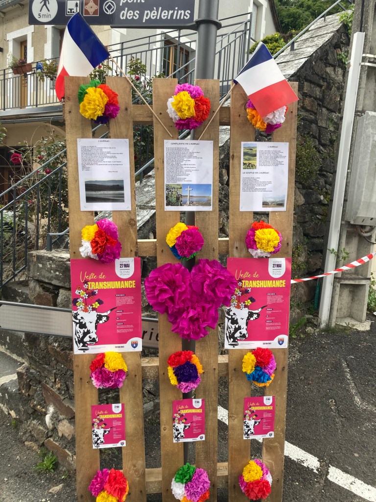 Saint-Chély-d’Aubrac ist geschmückt für die Festivitäten rund um den Viehtrieb, von gegenüber aus dem Rathaus ertönt laute Musik. Das Band hängt, was aber niemand zu kümmern scheint.