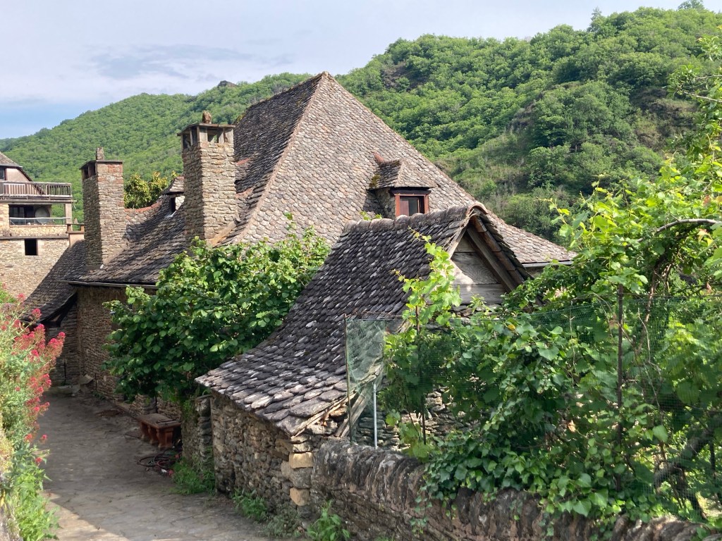 Die Etappe über Espeyrac und Sénergues ist sehr beschwerlich mit zahlreichen steilen An- und Abstiegen. Während der letzten ein bis zwei Gehstunden verdunkelt sich der Himmel und kündigt das übliche Nachmittagsgewitter an. Conques erreiche ich mit den ersten Regentropfen über steiles Kopfsteinpflaster, das sich durch die Nässe in eine Rutschbahn verwandelt. Ich flüchte mich erst einmal ins nächstbeste Restaurant, wo ich noch eine „last order“ für ein spätes Mittagessen aufgeben kann. Glück gehabt!